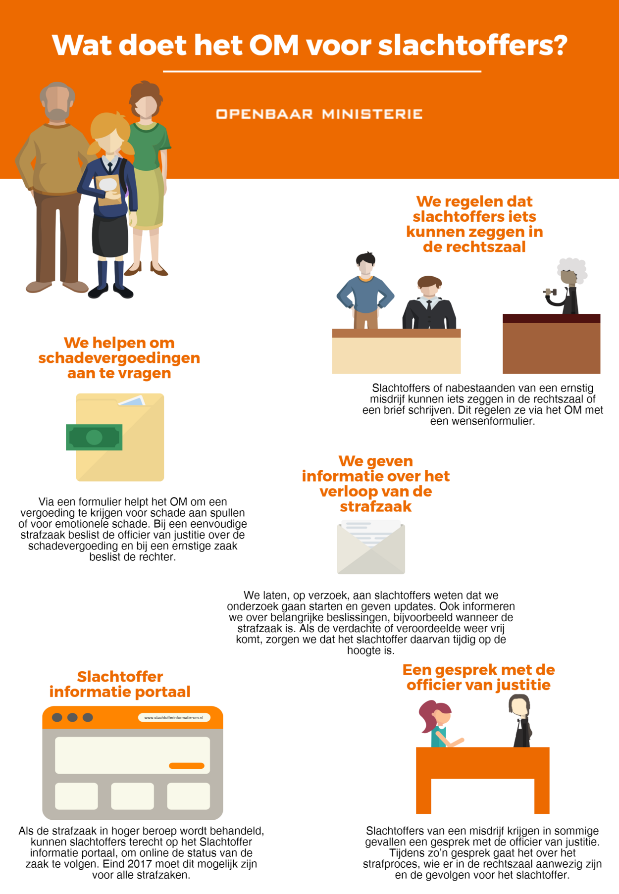 Zo staan er voorlichtingsfilmpjes op om.nl om slachtoffers te informeren over hun rechten en over wat het OM voor hen kan betekenen. Verder worden stukken vertaald in meerdere talen als dat nodig is. Brieven die het OM aan slachtoffers of nabestaanden stuurt zijn voortaan geschreven in begrijpelijker Nederlands.