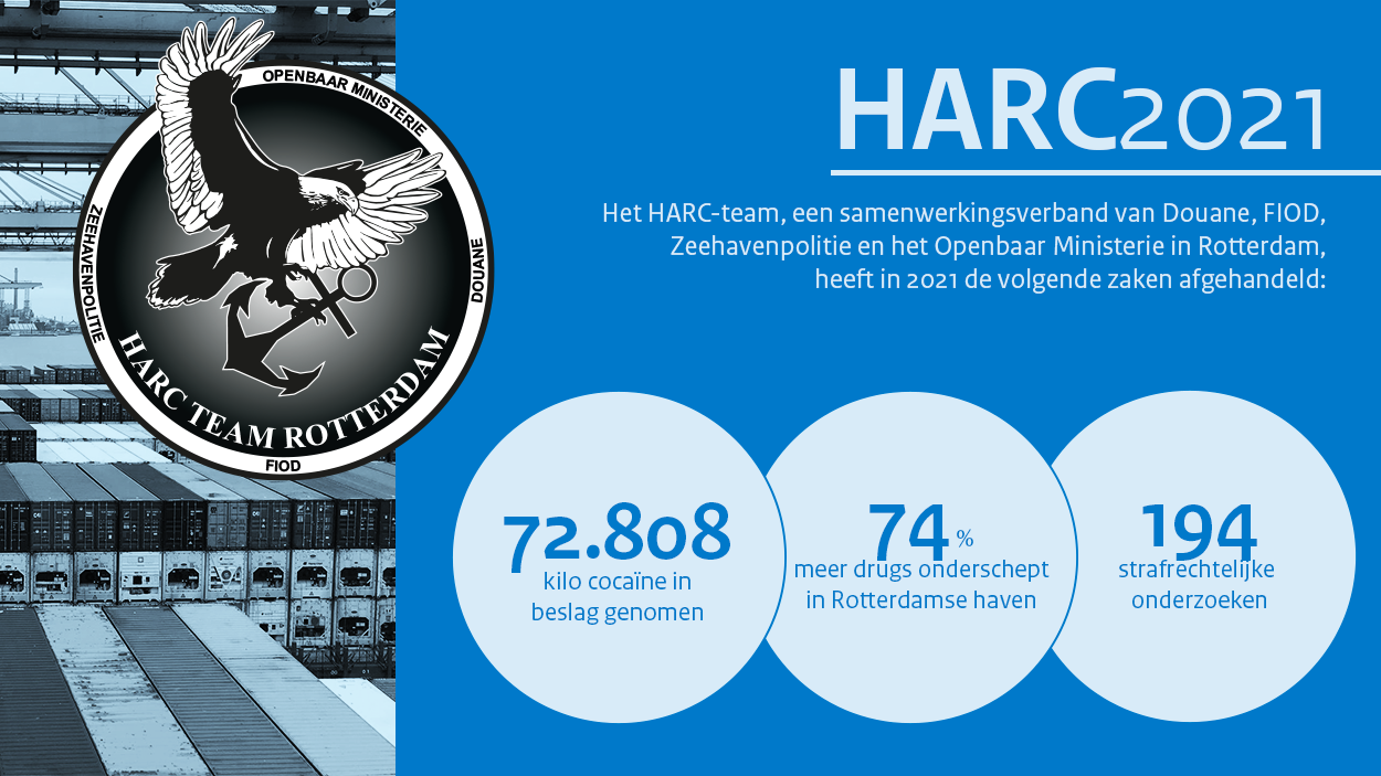 In 2021 heeft het Hit and Run Cargo-team (HARC), een samenwerkingsverband van Douane, FIOD, Zeehavenpolitie en Openbaar Ministerie in Rotterdam, in totaal 72.808 kilo cocaïne onderschept.