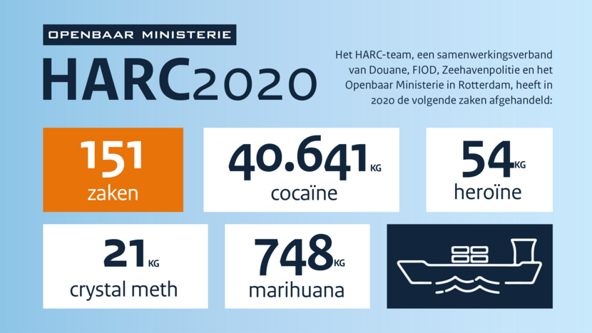 Het Hit and Run Cargo-team (HARC), een samenwerkingsverband van Douane, FIOD, Zeehavenpolitie en Openbaar Ministerie in Rotterdam, heeft in het afgelopen jaar in totaal 40.641 kilo cocaïne onderschept in de Rotterdamse haven. Dit is bijna 7.000 kilo meer dan in 2019. Toen werd 33.732 kilo verdovende middelen onderschept.