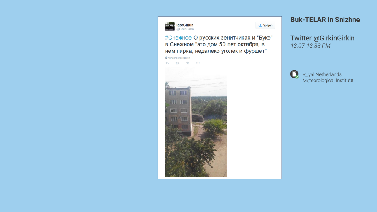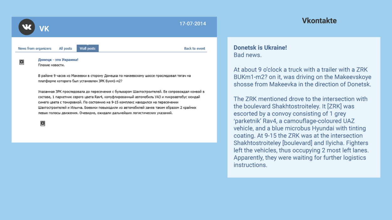 [131] Z-tap, 16-07-2014, 11:50:49u (Koreets spreekt over een luchtaanval die op dat moment plaatsvindt op Saur-Mogila, door een Sushka vanaf hele grote hoogte); Z-tap, 16-07-2014, 15:28:24u (Pulatov zegt tegen Koreets dat hij de lucht in de gaten moet houden omdat daar een “mother fucker” vliegt); Z-tap, 16-07-2014, 16:57:02u (Kutepov vertelt over een bombardement op Marinovka); Z-tap, 17-07-2014, 00:17:09u (Dubinskiy en Khodakovskiy bespreken luchtaanvallen van grote hoogte en het die nacht arriveren van een Buk).