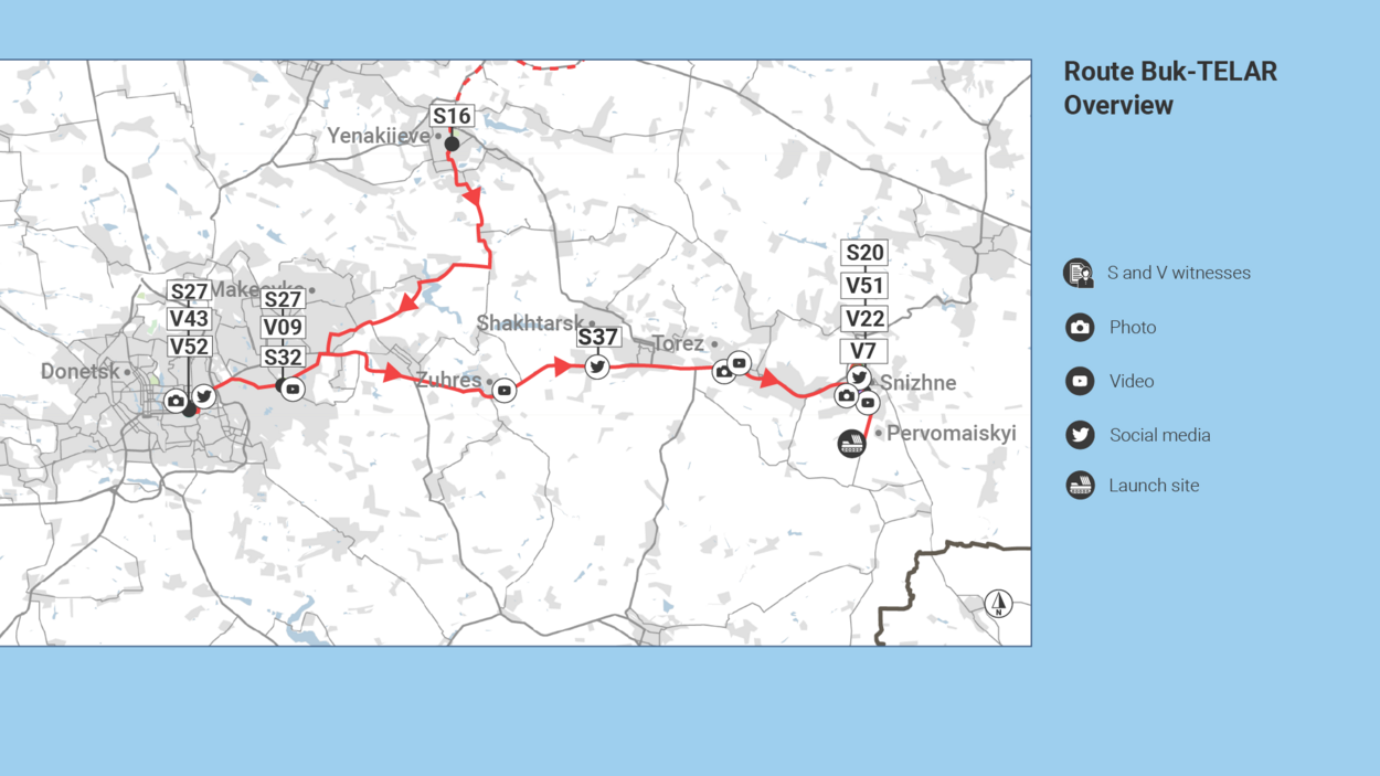 [182] Primo-02378 (zaakdossier aanvoerroute), p. 78; Primo-12438 (getuigendossier), p. 1210. Getuige S37 verklaart in 2017 dat hij op 17 juli in Shakhtarsk een konvooi heeft gezien. In dat konvooi reed een zwarte militaire bus met daarachter een Volvo met een lichtrode aanhanger met daarop een gele sticker met een mobiel telefoonnummer. Op de aanhanger stond een pantser met daarop raketten. Hij hoorde iemand in de menigte zeggen dat het voertuig een Buk was. Het konvooi reed richting Torez.[1]