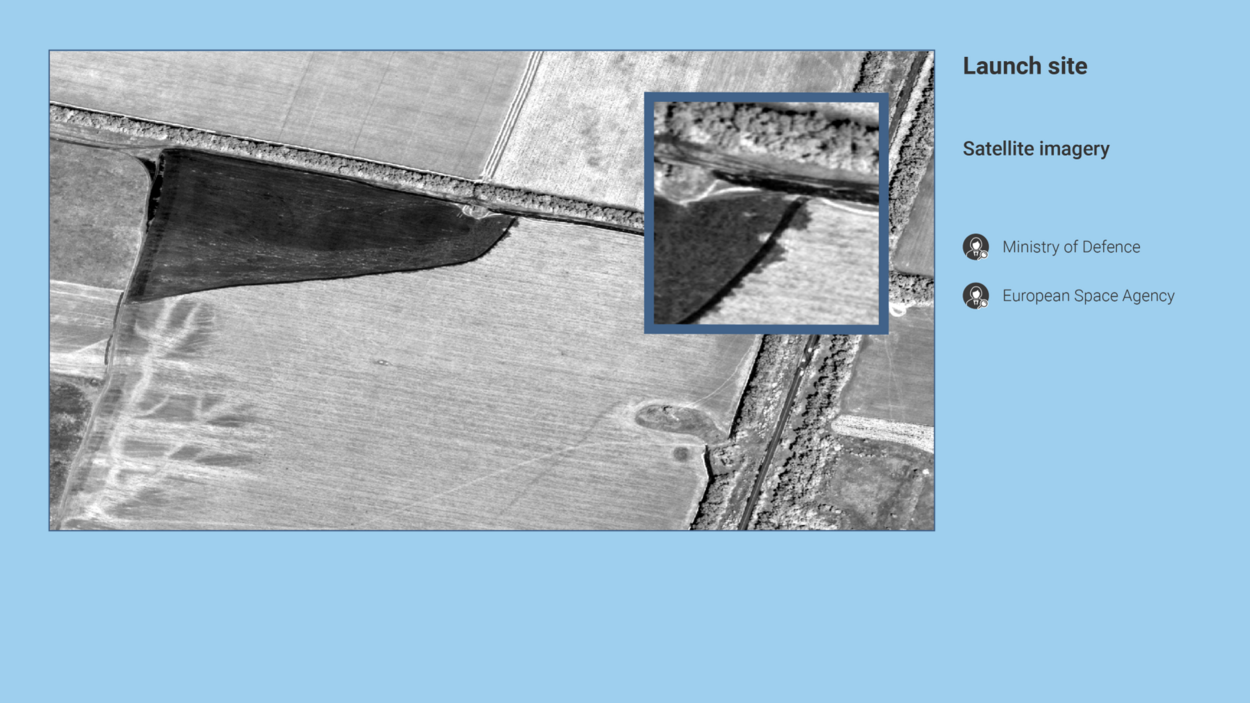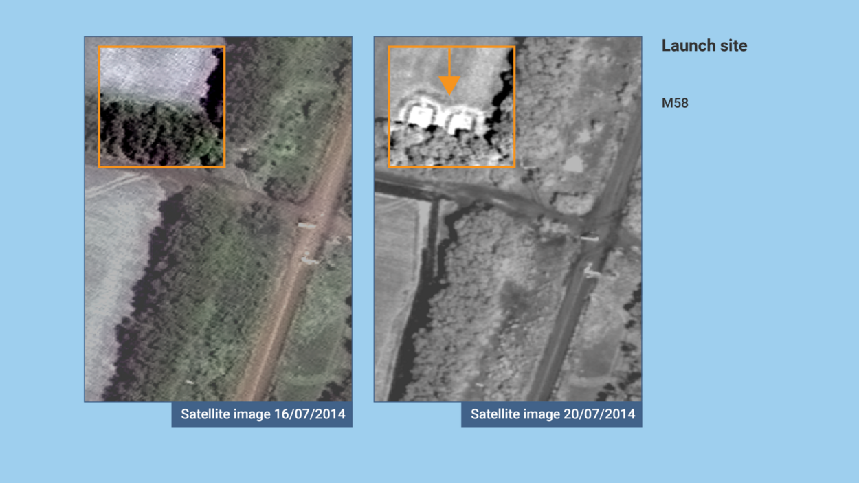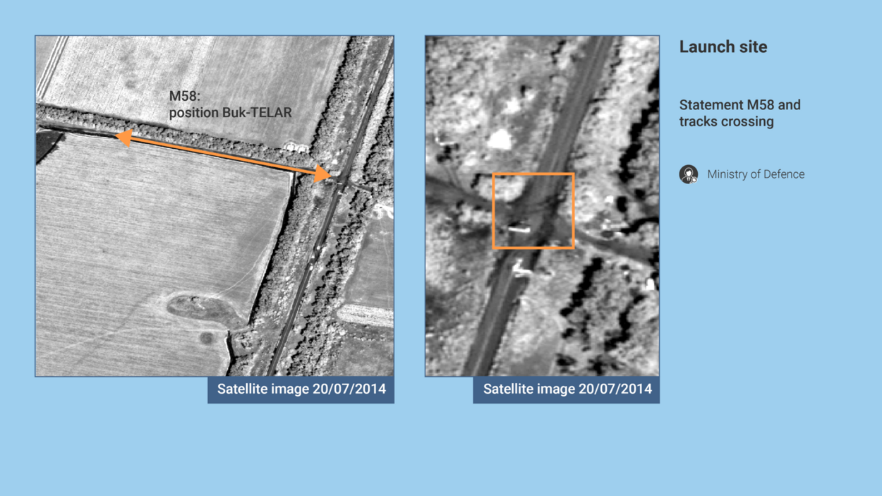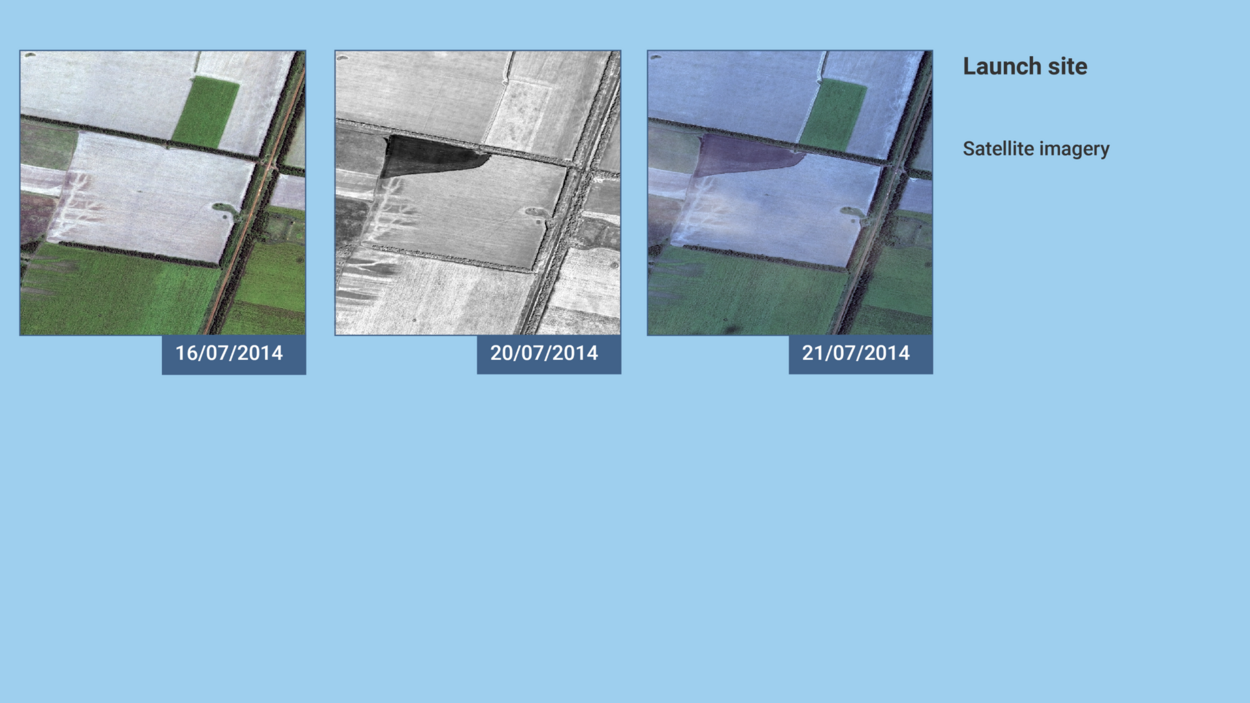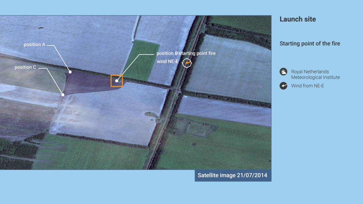 Bij de lancering van een raket ontstaat een steekvlam, die afhankelijk van de ondergrond voor brand kan zorgen. Op satellietbeelden van 20 en 21 juli 2014 is te zien dat de noordwestelijke hoek van dit veld zwart is, terwijl dit nog niet is te zien op de satellietfoto van 16 juli 2014. Om het zwarte deel is een donkere lijn zichtbaar. Volgens een beeldanalist van het ministerie van Defensie is deze donkere lijn een spoor ten gevolge van het omploegen van het land. Dit past bij de verklaring van getuige X48 dat de plek waar de raket is gelanceerd in brand is gevlogen en later door een tractor is omgeploegd. Ook de European Space Agency (ESA) heeft de satellietfoto’s beoordeeld. Volgens ESA past de zichtbare verandering in de noordwestelijke hoek van het veld bij de gevolgen van brand. Verder ziet ESA in beginsel geen reden voor een landbouwer om zijn veld op een dergelijke ongelijke wijze te verbranden of om te ploegen. Op oudere satellietbeelden van hetzelfde veld heeft ESA een dergelijke ongelijke bewerking van het veld niet gezien. ESA concludeert dan ook dat een abnormale gebeurtenis heeft plaatsgevonden in de noordwestelijke hoek van het veld tussen 16 juli en 21 juli 2014, die een significante degradatie van de aarde inclusief brand heeft veroorzaakt. Dit past bij een raketlancering.