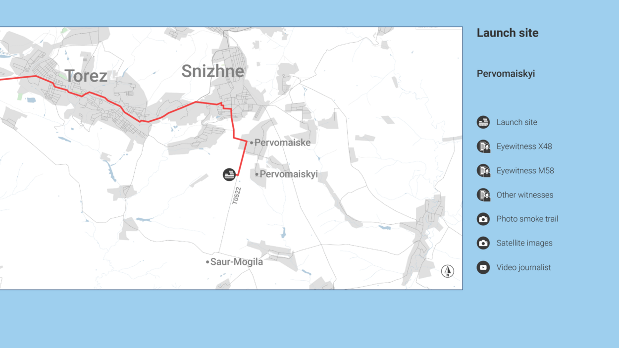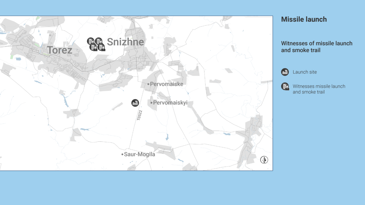 Een groot aantal getuigen heeft verklaard over een raketlancering vanuit de omgeving van Snizhne, Torez en Pervomaiskyi.