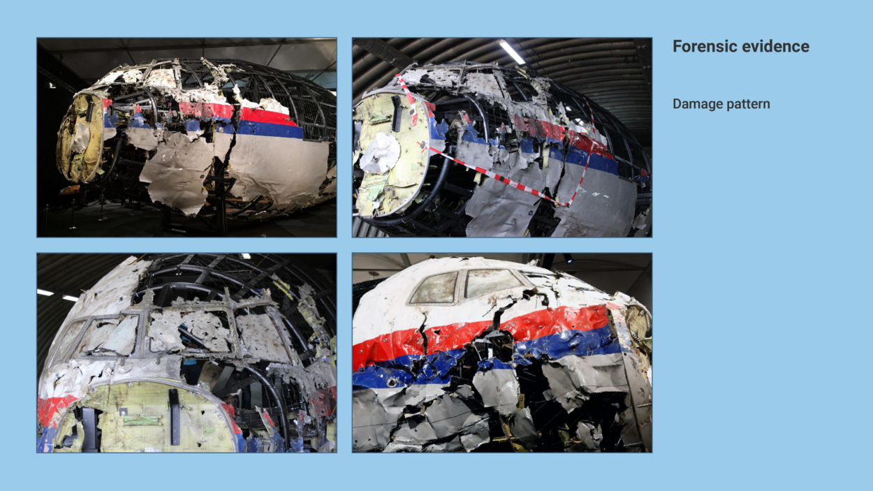 In de eerste plaats is dit het op de wrakdelen van MH17 waargenomen schadebeeld. Meer specifiek de honderden kleine en grotere perforaties, kraters, schampschade en beroeting, geconcentreerd aan de linker- en bovenzijde van de cockpit. De rechterzijde van het toestel vertoont dit schadebeeld niet. Richting de linker achterzijde neemt de concentratie van de schade zichtbaar af. Volgens de deskundigen van het Russische Almaz-Antey, het Nederlands Lucht- en Ruimtevaartcentrum (NLR) en de Belgische Royal Military Academy (RMA) past dit schadebeeld bij het gebruik van een Buk-raket.3