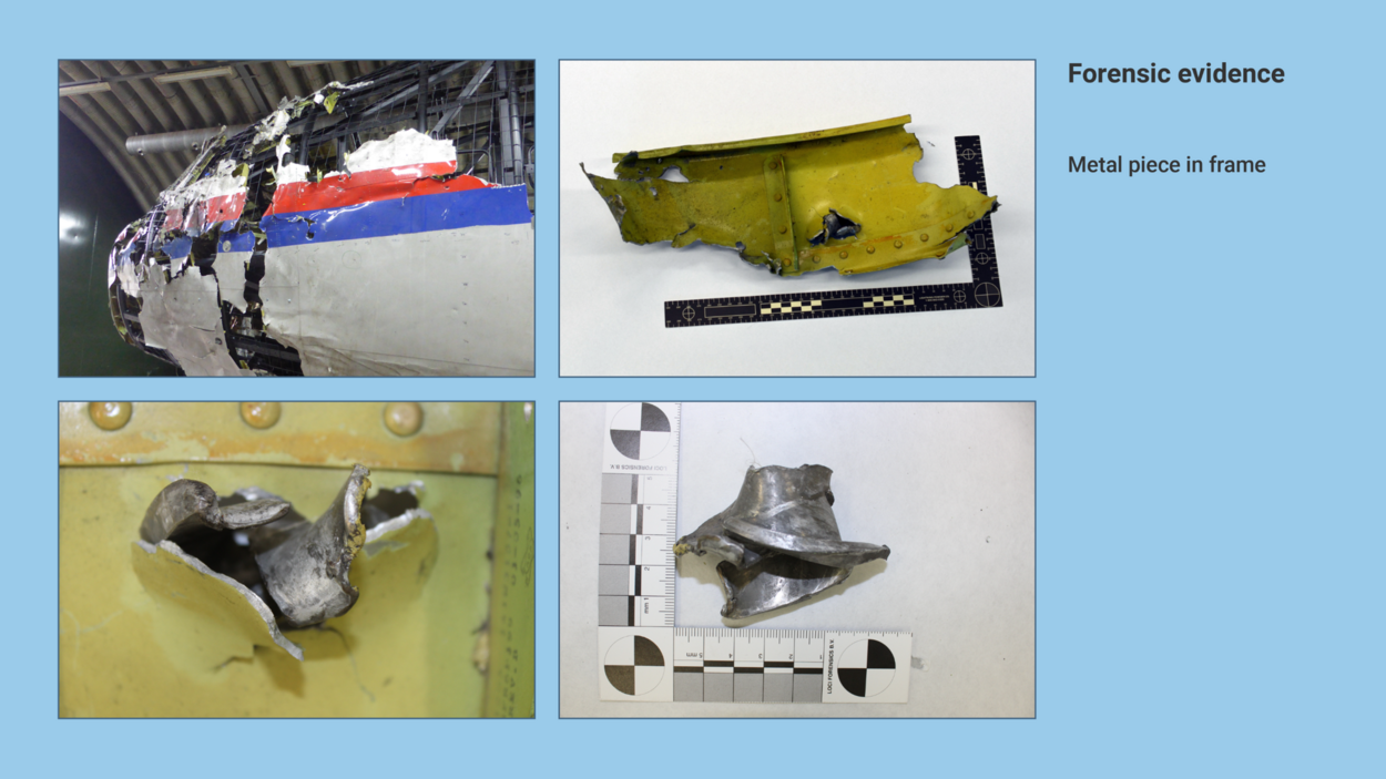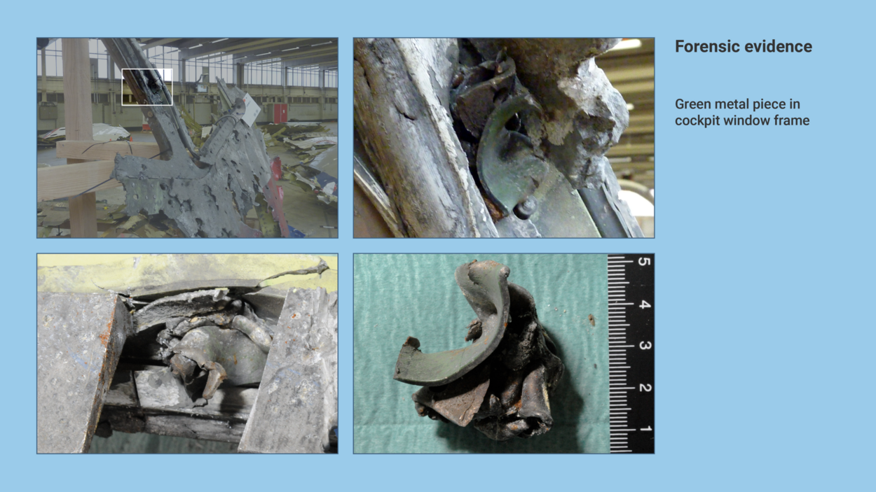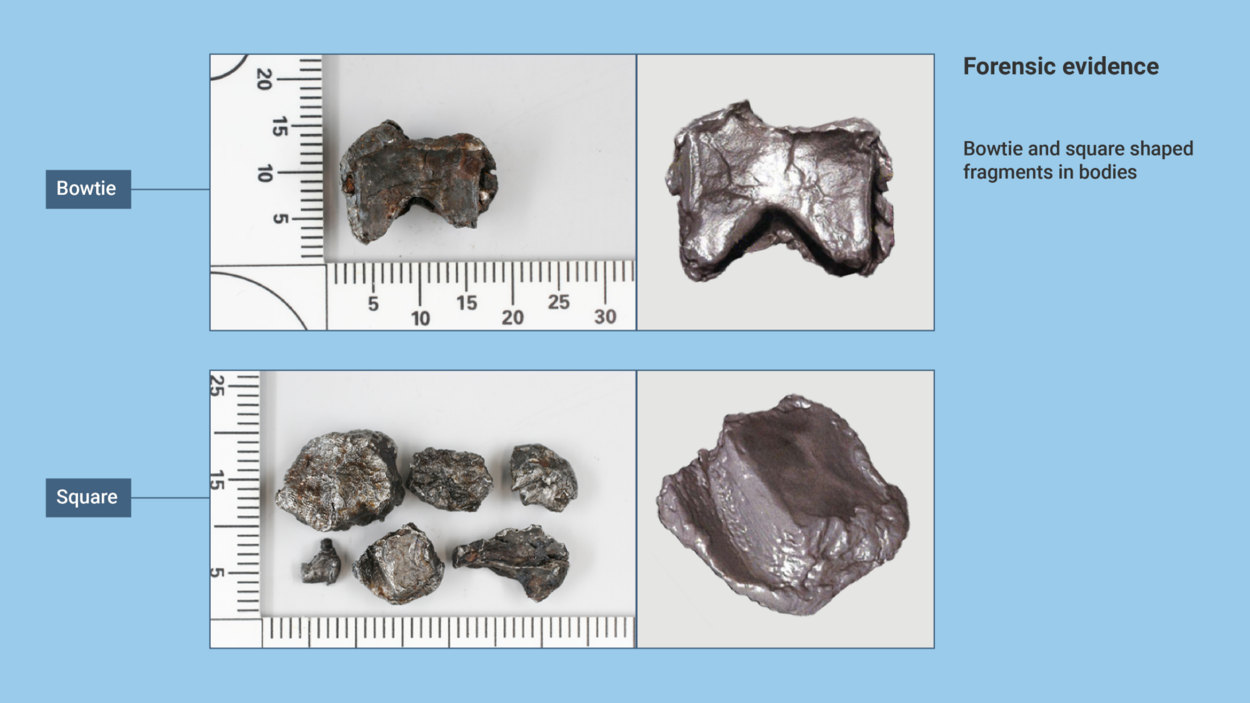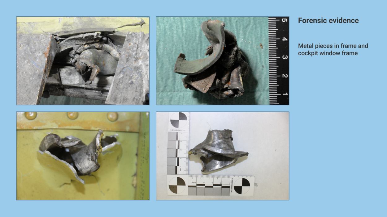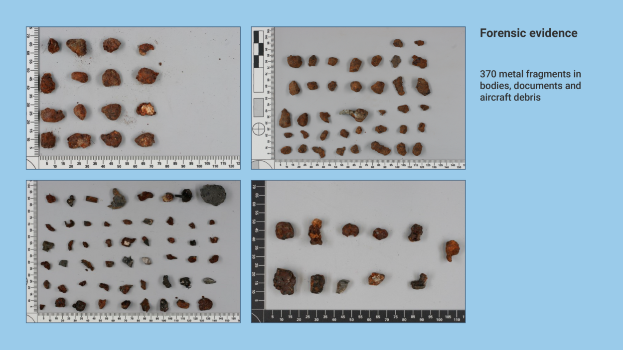 Als tweede wijzen wij op in de lichamen van slachtoffers, vluchtdocumenten en wrakdelen aangetroffen metaalfragmenten.