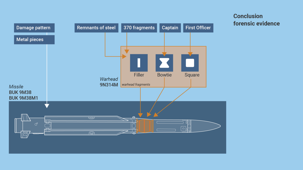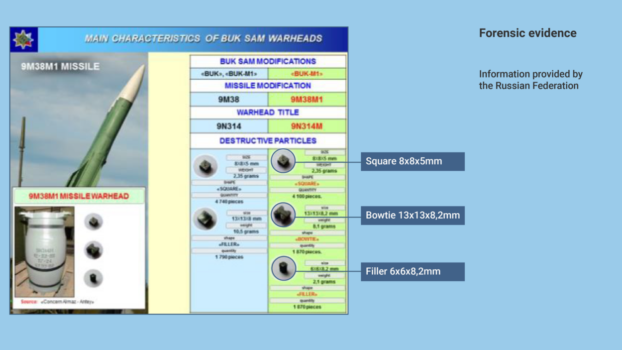 Het onderscheidende karakter van het vlindervormige fragment staat wat het Openbaar Ministerie betreft vast. De combinatie van vlindervormige en tegelvormige fragmenten komt alleen voor in een warhead van het type 9N314M. Met het aantreffen van een vlinder en een tegel in de lichamen van twee cockpitbemanningsleden is het gebruik van de 9N314M warhead dus een gegeven. Die warhead past zowel in een 9M38 als in een 9M38M1 Buk-raket.