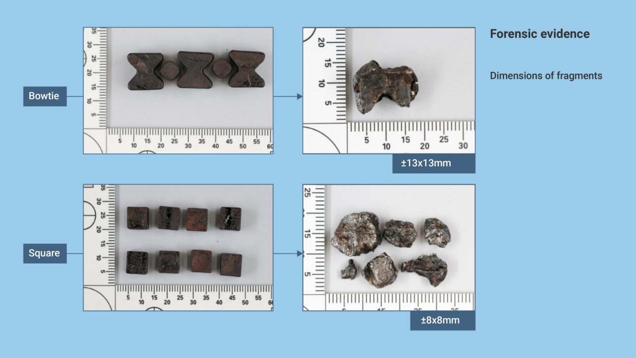 De Russische Federatie en Almaz-Antey hebben informatie verstrekt over vorm en afmetingen van de fragmenten uit de 9N314M warhead. De bowtie heeft een afmeting van ongeveer 13 bij 13 bij 8 mm, de tegel is ongeveer 8 bij 8 bij 5 mm groot en het staafje 6 bij 6 bij 8 mm. Deze afmetingen komen nagenoeg overeen met de afmetingen van de fragmenten zoals die door het JIT zijn vastgesteld bij de ontmanteling van een 9N314M warhead in Oekraïne. Op de fotos die we nu tonen is te zien dat de aangetroffen vlinder en tegel vrijwel dezelfde afmetingen hebben als de fragmenten met dezelfde vorm in de 9N314M warhead van een Buk-raket. Verder lijken zij op na afloop van de arenatesten in Finland en Oekraïne veilig gestelde vlinders en tegels.