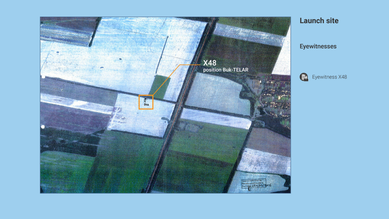 Hij ziet een donkergroene Buk rijden en hoort na vijf of zes minuten een ontploffing. Boven zijn hoofd loopt een raketspoor en in de lucht hoort hij een tweede explosie. Hij ziet stukken vliegtuig in een waaier naar beneden vallen. De Buk rijdt daarna naar de weg. Er ontbreekt dan één raket. X48 vertelt ook over vier soldaten die hem opvallen; zij zien er anders uit dan de militairen bij de controlepost en hebben een helm op met ‘oren’. Uit onderzoek volgt dat de communicatie binnen de TELAR gebeurt door middel van een tankcap, een beschermende helm met ‘oren’ en een geluidsverbinding. Na het neerkomen van de wrakstukken begeven deze vier militairen zich richting de controlepost. Getuige ziet dat de plek waar de raket is gelanceerd in brand vliegt en later door een tractor wordt (om)geploegd.