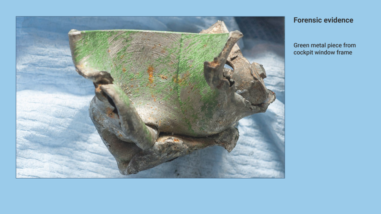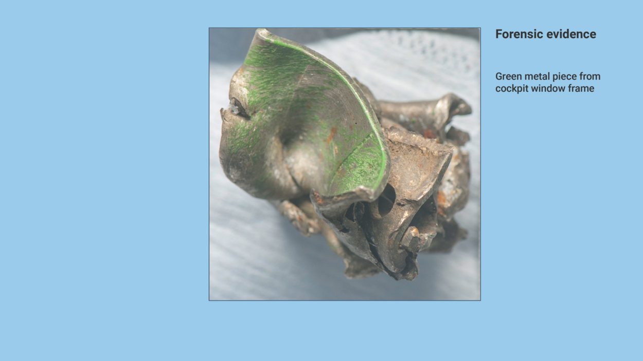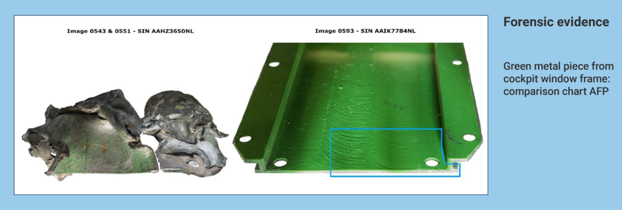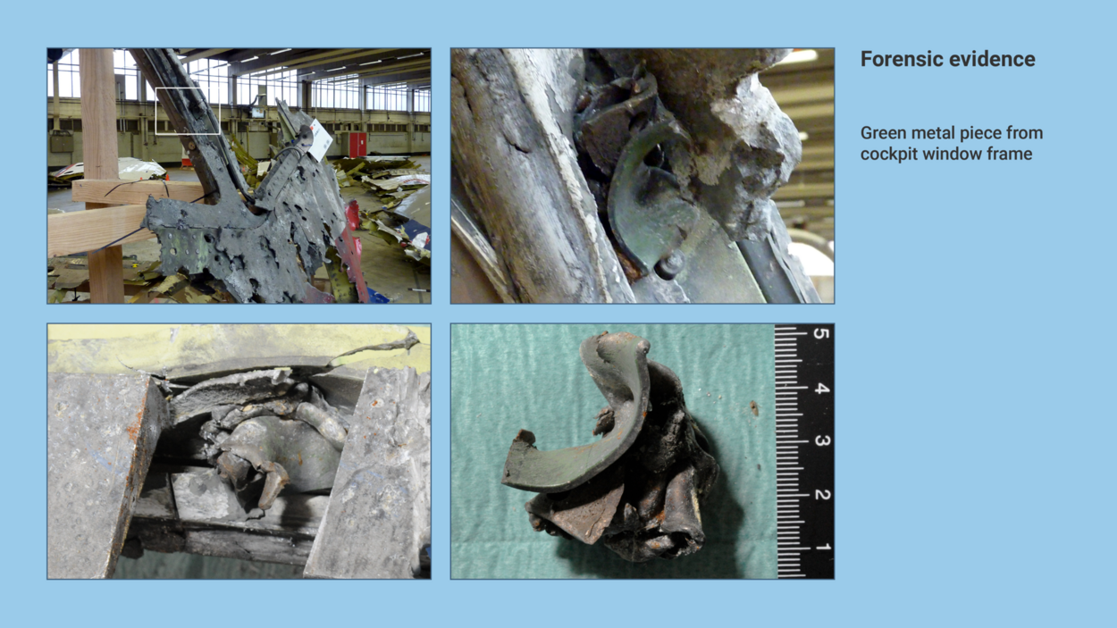 Op deze fragmenten zijn laagjes (opgesmolten) cockpitglas aangetroffen. Dit kan volgens het NFI alleen worden verklaard als de fragmenten van buiten het vliegtuig komen.