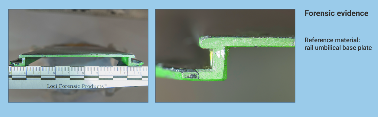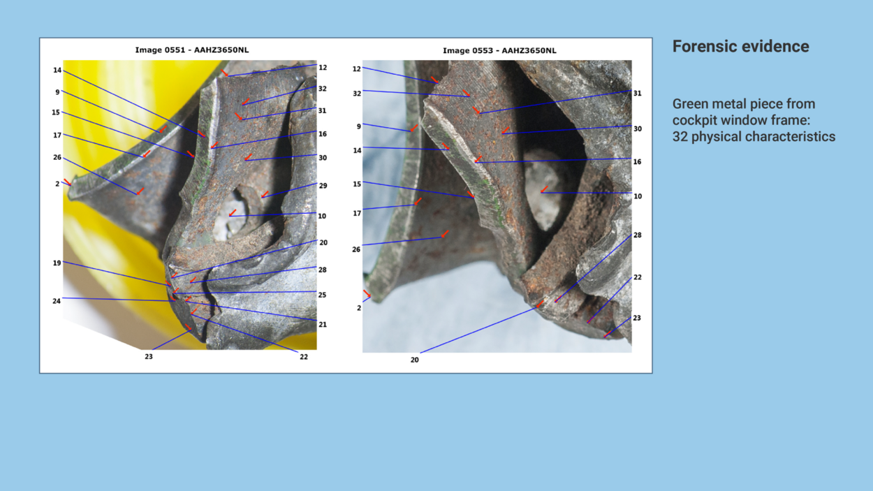 In een stuk spant aan de linkerzijde van de cockpit is vliegtuigvreemd materiaal aangetroffen in de vorm van een stuk roestvast staal (AAGK3338NL). In de sponning van het linker cockpitraam is een donkergroen verwrongen stuk metaal aangetroffen (AAHZ3650NL). Beide delen zaten klemvast in de vliegtuigwrakdelen. In het dossier worden deze delen ook wel ‘de prop’ (uit het spant) en ‘de groene prop’ (uit de sponning) genoemd. Het NFI heeft deze delen met behulp van een zaag uit de wrakstukken verwijderd, waarna de prop uit het spant in drie stukken is gezaagd. Vervolgens zijn alle delen onderzocht door het NFI en door forensische specialisten van de Australische Federale Politie (AFP). Wij staan nu eerst stil bij het NFI-onderzoek.
