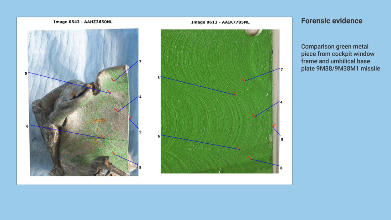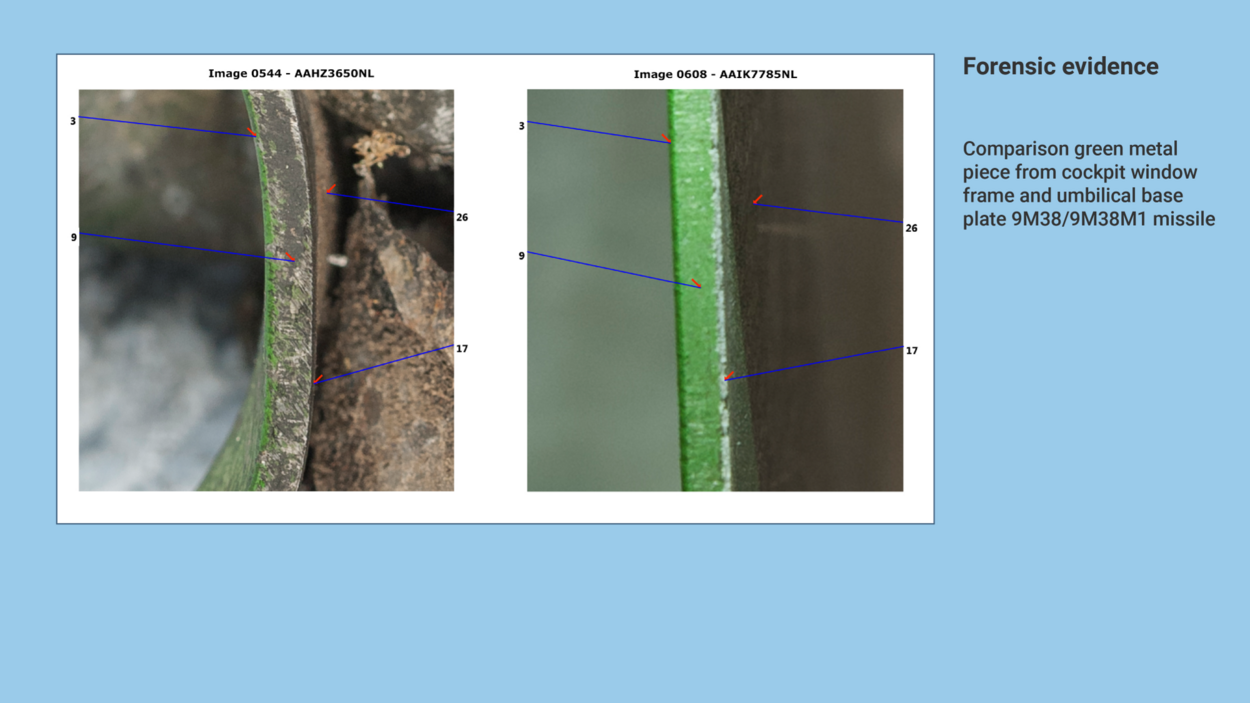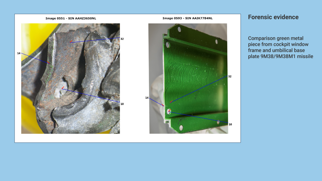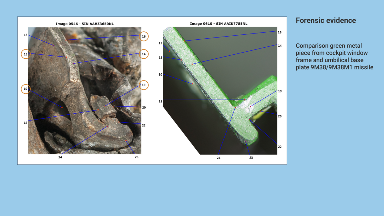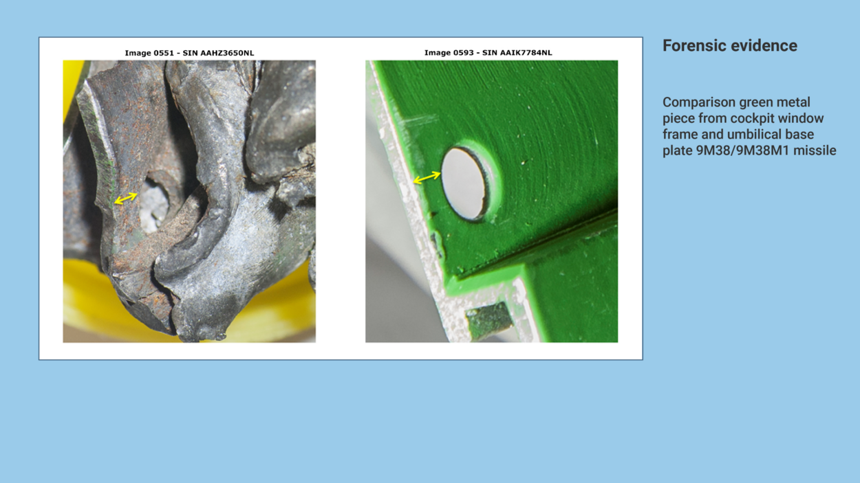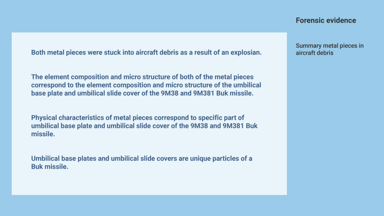 Het NFI heeft de elementsamenstelling en de microstructuur van deze deeltjes bepaald. Beide deeltjes bestaan uit martensitisch warmgewalst roestvaststaal. Ook heeft het NFI van diverse onderdelen van meerdere referentie Buk-raketten de elementsamenstelling en microstructuur bepaald. Onder meer van de schuif- en grondplaten. Deze schuif- en grondplaten bevinden zich op een contactpunt in het staartdeel van de Buk-raket, waaraan een kabel van het Buk-lanceervoertuig is gekoppeld. Het deeltje uit het spant en het deeltje uit de sponning van het cockpitraam zijn op basis van elementsamenstelling en microstructuur niet te onderscheiden van de schuif- en grondplaten van de 9M38 referentieraket en één van de twee 9M38M1 referentieraketten. Met andere woorden: deze deeltjes zijn volgens het NFI uit hetzelfde materiaal geproduceerd als de schuif- en grondplaten van deze Buk-referentieraketten. Het NFI werkt in dit soort onderzoeken vaak met verschillende hypotheses, waarbij de resultaten van het onderzoek worden vertaald naar de mate van waarschijnlijkheid of onwaarschijnlijkheid dat een bepaalde hypothese klopt. In dit geval zijn de bevindingen volgens het NFI veel waarschijnlijker (dus veel beter te verklaren) wanneer deze deeltjes afkomstig zijn van de schuif- en grondplaten van een Buk-raket dan wanneer ze afkomstig zouden zijn uit andere bron, zoals een ander wapen.
