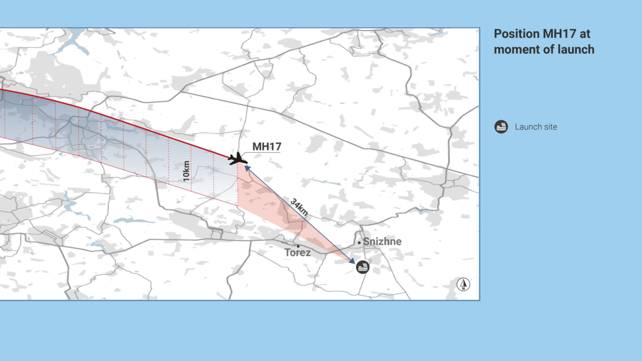 Ten tijde van de lancering vliegt MH17 op ongeveer 10 kilometer hoogte en zo’n 34 kilometer ten noordwesten van de door X48 en M58 aangewezen locatie. Tussen het moment van de lancering van de raket en het raken van MH17 zitten ongeveer 32 seconden.