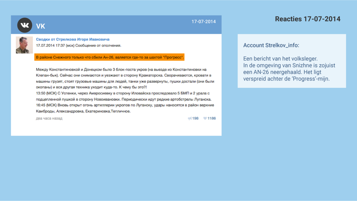 [14] 19 juni 2019: ‘Omdat ik telefonisch bedolven wordt door vragen van allerlei correspondenten, en ik bedolven wordt door dergelijke vragen van mijn volgers, herhaal ik nogmaals wat ik al vanaf juli 2014 tot op heden schrijf en zeg: “Verzetsstrijders hebben de Boeing niet neergehaald. Ik geef geen enkel commentaar op die tragedie noch op de loop van het onderzoek in deze zaak.” in Primo-13042, bijlage 1 (bijlagendossier), p. 13509; 7 juli 2019: ‘Hoewel ik als actieve deelnemer aan deze oorlog indirect aansprakelijk ben – maar dan uitsluitend in de ogen van God – voor alle slachtoffers van deze oorlog, heb ik schoon geweten voor wat betreft de dood van deze 298 burgers. De opstandelingen hebben de Boeing niet neergehaald’ in Primo-13888 (bijlagendossier), p. 13736; 15 november 2019: ‘militietroepen hebben de Boeing niet neergeschoten’ in Primo-13752 (bijlagendossier), p. 13658.
