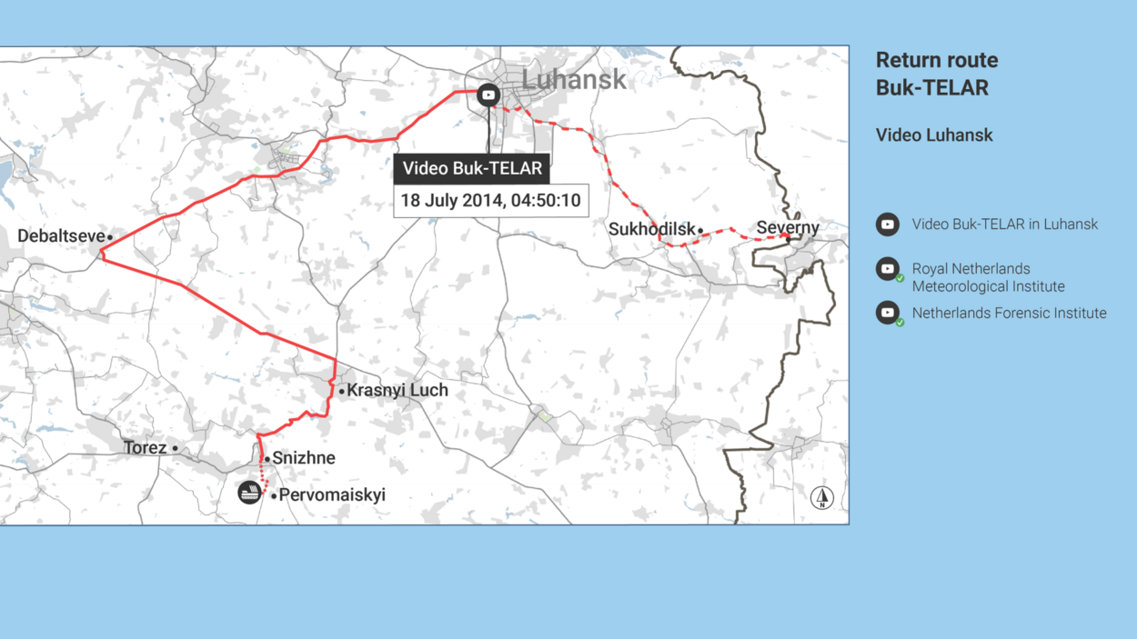 We zetten het voorgaande weer even op een rij. Als we de route van de aanvoer van de Buk-TELAR volgen en de tapgesprekken over de bestemming beluisteren, komen we uit op een landbouwveld bij een controlepost nabij Pervomaiskyi. Dat de Buk-TELAR daar in de middag van 17 juli 2014 ook daadwerkelijk een Buk-raket heeft afgevuurd is gezien door verschillende getuigen. In de eerste plaats zijn dat X48 en M58, die dezelfde middag op deze afvuurlocatie aanwezig zijn. Verder zijn er vele andere getuigen die de vlucht van een raket of een daarop gelijkend voorwerp zien. Eén van hen maakt hiervan twee foto’s, waarop een verticaal rookspoor is te zien dat niet past bij een vliegtuig en dat uit de richting komt van hetzelfde veld bij Pervomaiskyi als waarover X48 en M58 verklaren. Op dat veld laten de TELAR en de Buk-raket sporen achter, die op satellietfoto’s en een video zijn terug te zien: tracksporen en brandsporen. Die sporen komen overeen met wat getuigen X48 en M58 op dat veld hebben waargenomen.