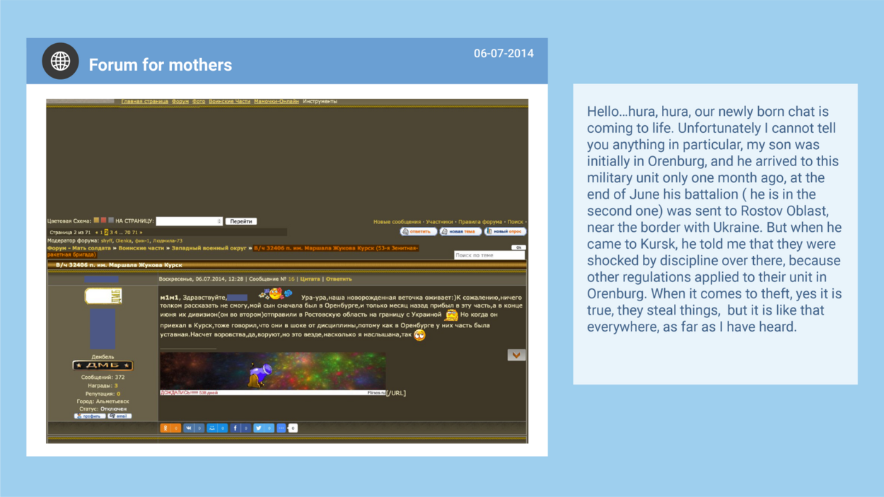 “We waren heel blij, want ze zeiden tegen ons dat er een militair transportvliegtuig was geraakt. Dat zei iedereen, ook de commandanten. (..) En ik heb gesproken met iemand die de commandant was van hen, een stevige jongen, een plaatselijk iemand, een Oekraïner. Hij zei: we gaan nu naar de plek waar [het] vliegtuig is neergekomen en hij was net als wij blij. Ze zijn weggereden. (…) Ze zijn na een uur of misschien iets later teruggekeerd, zagen er somber uit. Ik vroeg: wat is er aan de hand. Hij zei: het is geen militair vliegtuig, hij zei: er liggen allerlei…”