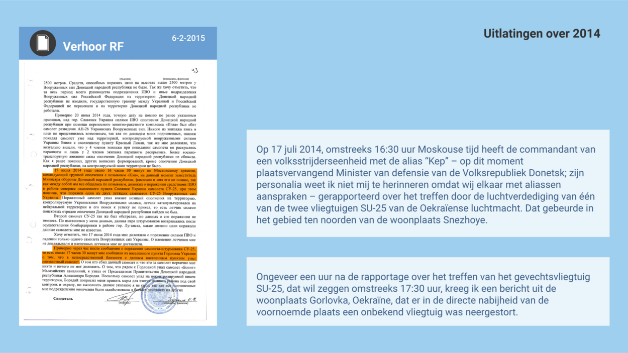 [12] 1 april 2020: ‘Ik lever vrijwel geen commentaar in verband met het neerhalen van de Boeing; de volksweer heeft de Boeing niet neergehaald. De volksweer beschikte niet over wapens om die Boeing mee neer te halen.’ in Primo-14484, bijlage 1 (bijlagendossier), p. 16750.