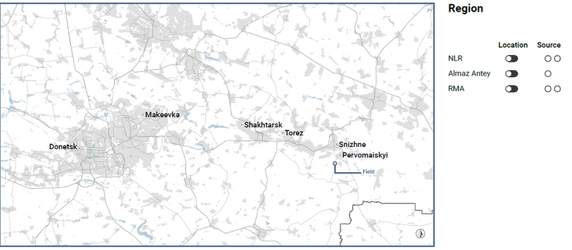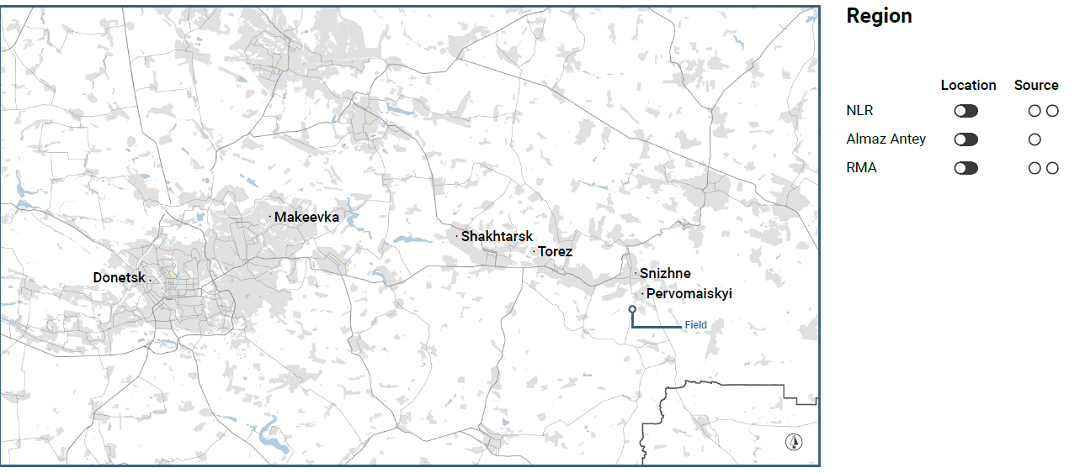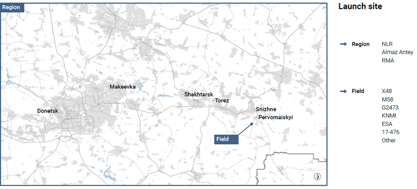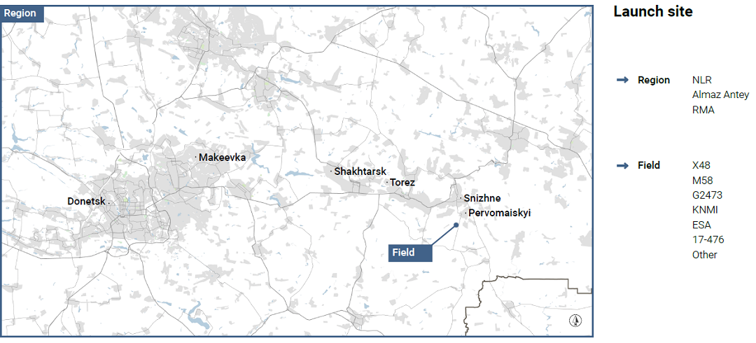 Deze visualisatie is gemaakt op twee niveaus: de regio waarin het landbouwveld ligt en het landbouwveld zelf. Het onderdeel ‘region’ bevat de door NLR, RMA en Almaz Antey berekende lanceergebieden. Hoewel we niet nader in zullen gaan op deze berekeningen, laten we de verschillende gebieden omwille van de externe openbaarheid zien terwijl ze geplot zijn op één kaart.