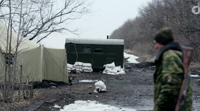 In het dossier bevindt zich een video van de documentaire ‘Todesflug MH17’, die op 27 april 2015 werd uitgezonden op de Duitse zender ARD. In deze documentaire is het checkpoint - oftewel een blockpost - te zien aan de landweg T0522, vlakbij het landbouwveld. In die documentaire is ook een tent te zien. Die laten wij nu zien. De lichtgekleurde tent ziet u links in beeld. Ik wijs ook hier op de vorm en de ingang.