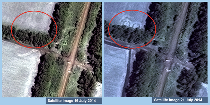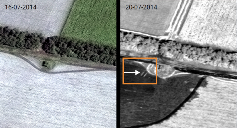 Tot slot de bevindingen van de beeldspecialist. Rechts ziet u het satellietbeeld van 20 juli 2014, met in het oranje kader de sporen die door de beeldspecialist van defensie als tracksporen worden herkend. Op de linkerfoto ziet u dat deze sporen op 16 juli 2014 ontbreken.