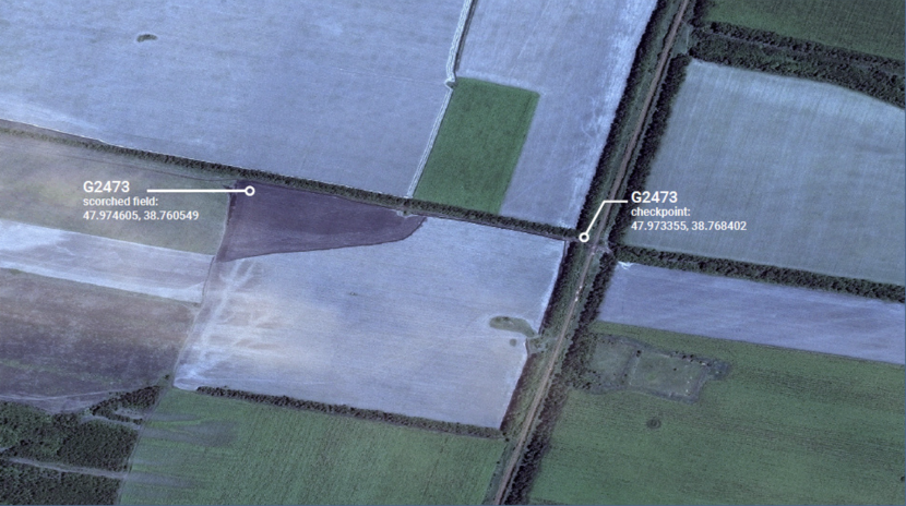 In de linker bovenhoek van het veld ziet u de locatie waar de journalist de brandplek zag. Het rechter punt, in het midden van de afbeelding, is de locatie van het checkpoint.