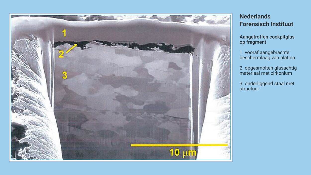 - Ten slotte werden metaaldelen met daarop gesmolten cockpitglas aangetroffen in de lichamen van de cockpitbemanning. U ziet hier een afbeelding uit een rapport van het Nederlands Forensisch Instituut (NFI). Deze afbeelding is gemaakt met een elektronenmicroscoop. Onder 1 is een laagje platina te zien dat is aangebracht voor het onderzoek. Onder 3 is het stalen deeltje te zien. Daartussen, onder 2, bevindt zich het laagje opgesmolten cockpitglas: de zwarte rand op de foto. Zulke metaaldelen moeten dus het cockpitglas hebben doorboord voor zij de slachtoffers raakten, wat alleen past bij een explosie van buiten het vliegtuig.