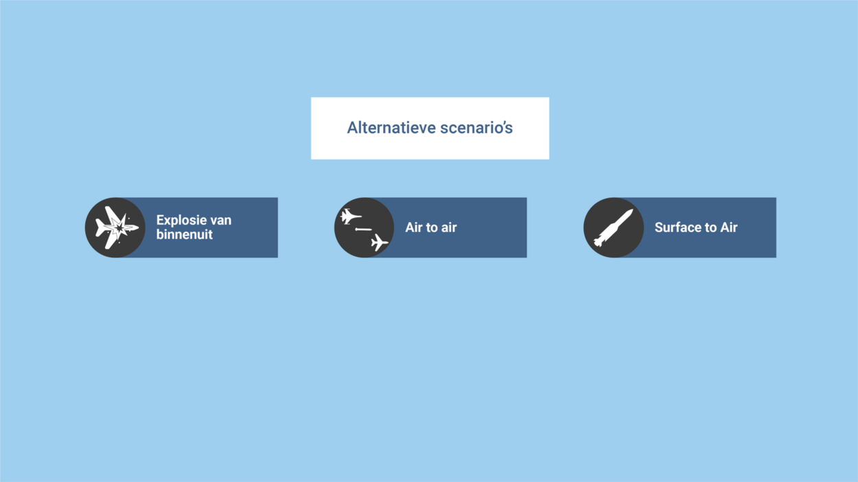 Het onderzoek van het JIT naar de andere scenario’s is ook voortgezet nadat het forensisch onderzoek al concreet bewijs opleverde dat vlucht MH17 is neergeschoten door een Buk raket en het uitluisteren van tapgesprekken belangrijk bewijs opleverde over het gebruik van een afvuurlocatie bij Pervomaiskyi. De juistheid van het hoofdscenario hebben wij niet alleen onderzocht door het bewijs hiervoor kritisch te analyseren, maar ook door op zoek te gaan naar bewijs voor alternatieven. Deze andere scenario’s worden in het dossier wel ‘alternatieve scenario’s’ genoemd; ook deze zijn langdurig en uitgebreid onderzocht en in het procesdossier beschreven.