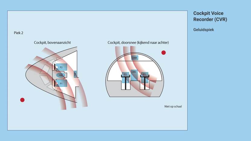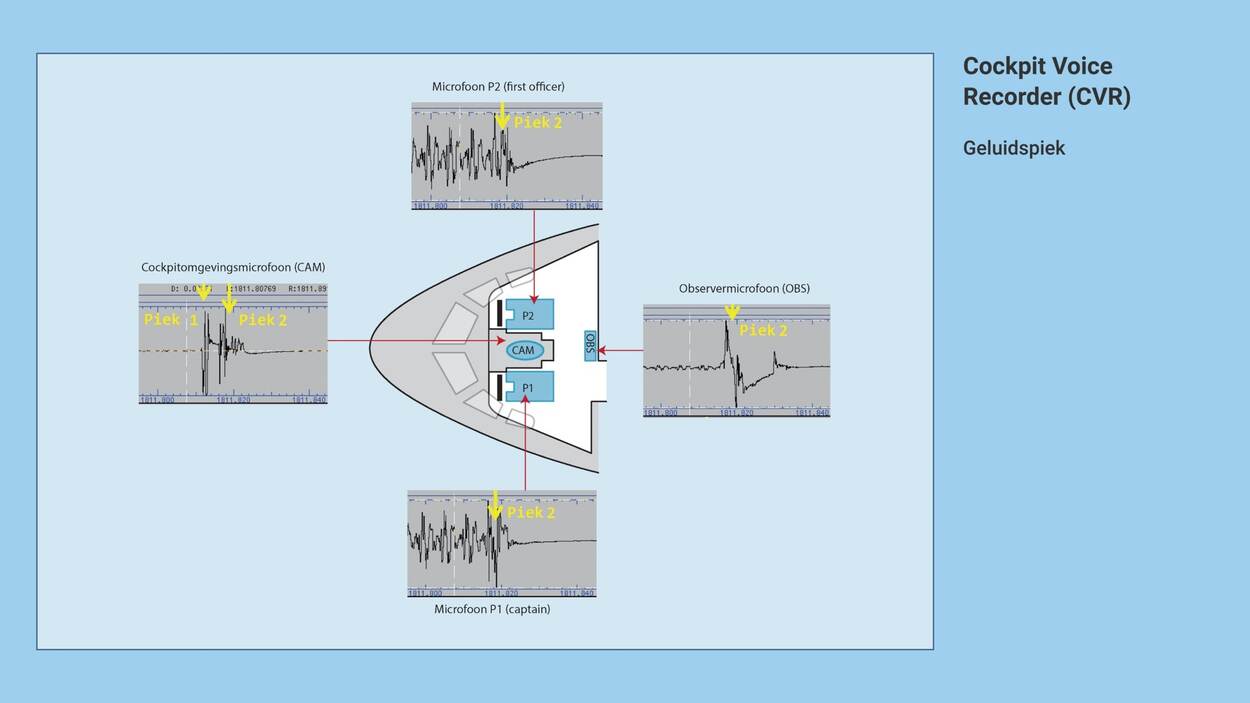 De Cockpit Voice Recorder (CVR) van MH17 is aangetroffen op één van de plekken waar delen van het toestel zijn neergestort. De Cockpit Voice Recorder is overgedragen aan de Onderzoeksraad voor Veiligheid (OVV) die onderzoek heeft gedaan naar die CVR. Daarna is deze ook binnen het opsporingsonderzoek onderzocht. Kort voordat de recorder stopte met opnemen, is in de laatste 20 milliseconden een ultrakorte geluidsgolf van buiten het vliegtuig opgemerkt. Deze geluidsgolf is zo kort dat deze niet hoorbaar is met het oor, maar de geluidsgolf kon wel worden uitgelezen. U ziet op deze afbeelding, afkomstig uit het rapport van de Onderzoeksraad voor Veiligheid, hoe de geluidsgolf verschillend is geregistreerd door vier microfoons in de cockpit. Deze afbeelding kijkt als het ware van boven op de cockpit. Op deze afbeelding ziet u links hetzelfde bovenaanzicht van de cockpit. De geluidsgolf kwam van buiten het vliegtuig vanaf een positie boven de linkerzijde van de cockpit en ging van voren naar achteren. Met de linkerkant wordt bedoeld de kant die links is als vanaf de achterkant van het vliegtuig naar voren wordt gekeken. Deze oorsprong en richting konden worden vastgesteld omdat zich in de cockpit meerdere microfoons bevonden en er onderling kleine verschillen waren in de tijdsregistratie van de geluidsgolf. Dit is op de linkerhelft van deze afbeelding weergegeven met een rode stip op de plek waar ongeveer de explosie moet hebben plaatsgevonden. De richting van de geluidsgolf is hierbij afgebeeld met de rode banen. Dit verklaart waarom deze geluidsgolf door de verschillende microfoons in de cockpit op verschillende wijzen is geregistreerd. Op de rechterhelft van deze afbeelding is dit weergegeven in een vooraanzicht van de cockpit. Het is als het ware alsof je voor het vliegtuig staat en recht de cockpit inkijkt. Opnieuw geeft de rode stip bij benadering de plaats van de explosie weer, boven de linkerzijde van de cockpit.