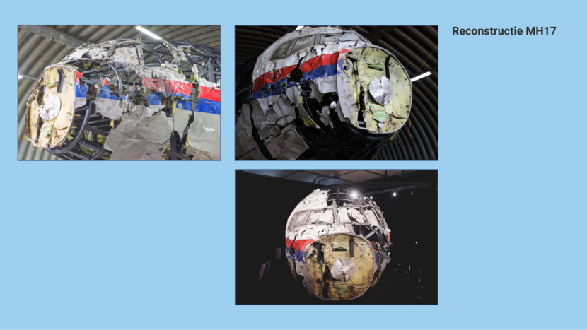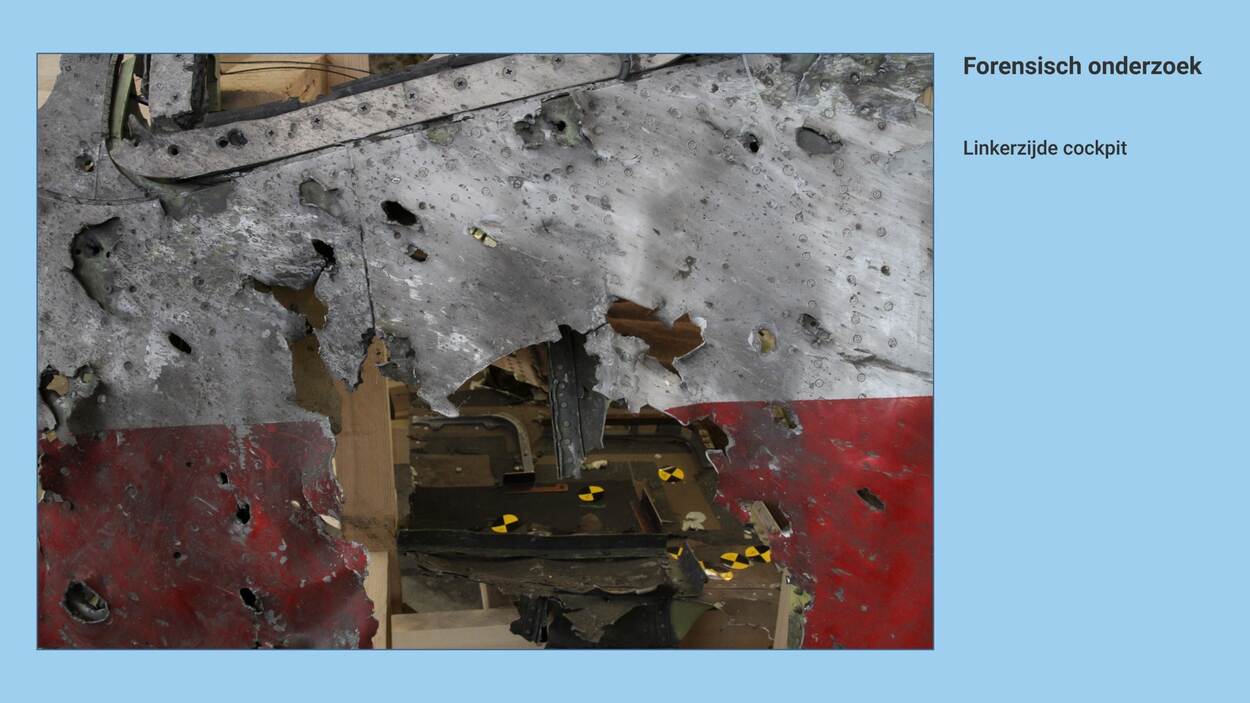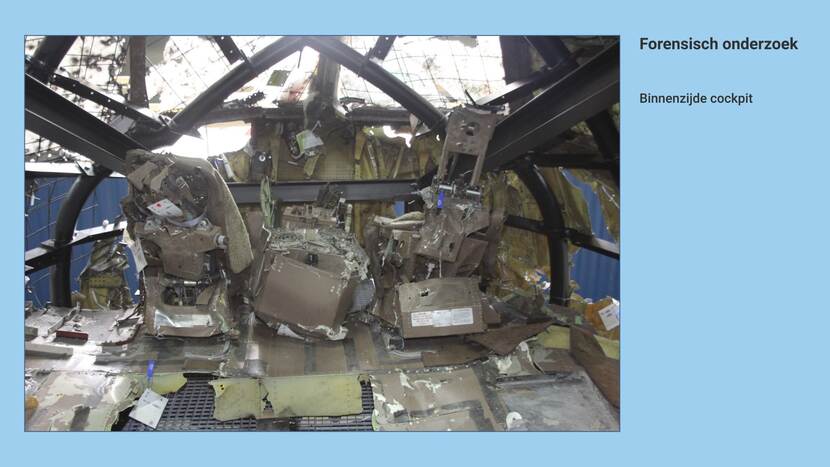 - Een belangrijke aanwijzing dat er geen sprake kon zijn geweest van een explosie van binnenuit het vliegtuig, was het aantreffen van beroeting aan de buitenzijde van wrakstukken van MH17. Aan de binnenzijde van de wrakstukken was deze beroeting niet te zien.U ziet hier de binnenzijde van de cockpit zoals gereconstrueerd in Nederland.
