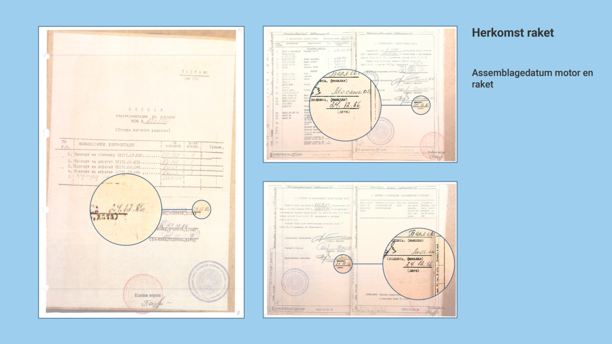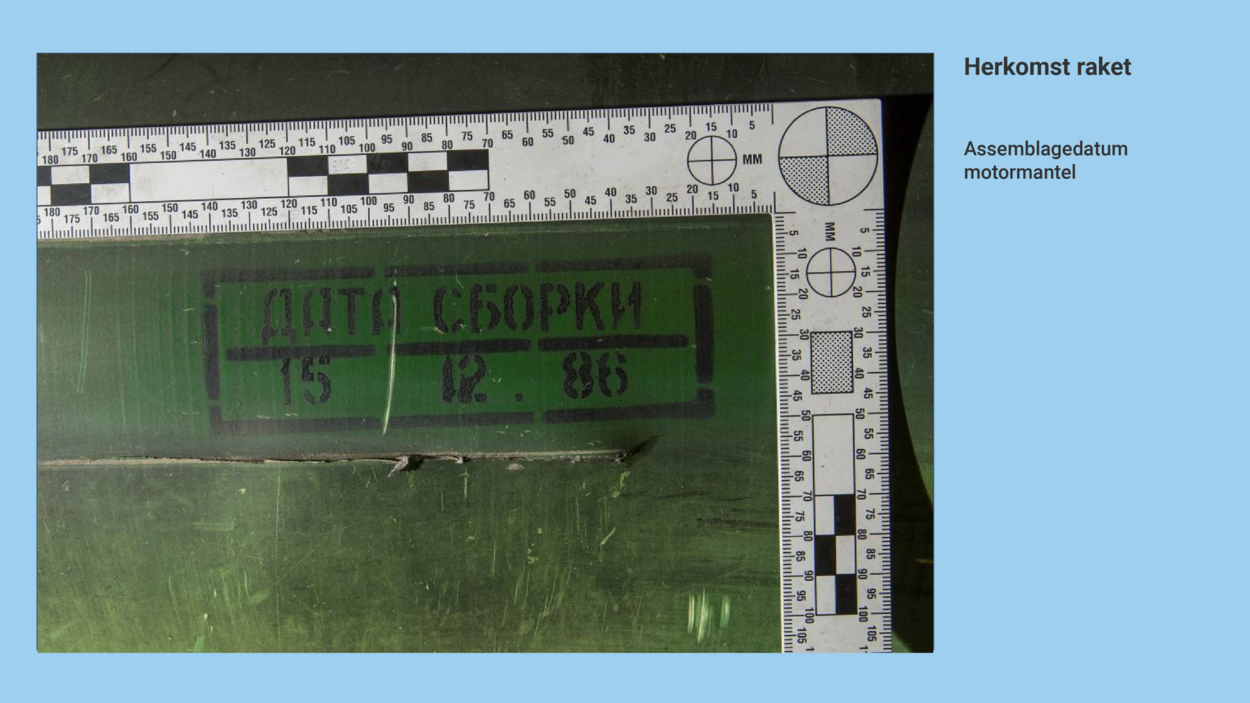 Verder zijn de assemblagedata in de Russische documenten geanalyseerd en vergeleken met een datum die tijdens het forensisch onderzoek op de motormantel was aangetroffen. Hierbij is een opmerkelijk verschil gevonden. Volgens die documenten zijn de onderdelen van de raketmotor én de volledige raket op 24 december 1986 geassembleerd. U ziet hier verschillende documenten, waarop dit staat vermeld. Op de motormantel die in het forensische onderzoek is aangetroffen, en waarop de verstrekte documenten betrekking zouden hebben, staat iets anders. Op die mantel staat een sjabloon met ‘assemblagedatum 15 december 1986’. Deze datum is niet verstrekt aan de Russische autoriteiten in het rechtshulpverzoek van 2018, waarin om informatie werd gevraagd over de twee aangetroffen raketdelen. De datum die op de motormantel is aangebracht als ‘assemblagedatum’ komt dus niet overeen met de assemblagedata in de Russische documenten.