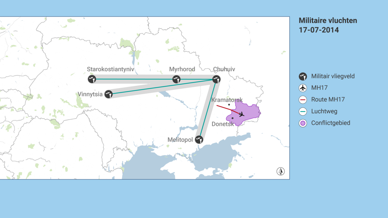 Er is ook informatie opgevraagd bij de Oekraïense overheid over vliegbewegingen in Oost-Oekraïne op 17 juli 2014. Volgens de Oekraïense autoriteiten hebben op 17 juli 2014 verschillende vluchten plaatsgevonden, maar stonden alle militaire vliegtuigen aan de grond op het moment dat MH17 werd neergeschoten. U ziet hier een weergave van de ontvangen informatie. De groene lijnen zijn militaire vluchten die op 17 juli zijn uitgevoerd: deze waren allemaal buiten het conflictgebied, dat hier in paars is aangegeven. De rode lijn betreft het laatste deel van de door MH17 afgelegde route. Volgens deze door Oekraïne verstrekte vluchtgegevens zijn op 17 juli 2014 de hele dag geen militaire vluchten uitgevoerd in het luchtruim van Luhansk Oblast of Donetsk Oblast.