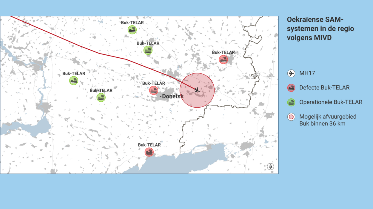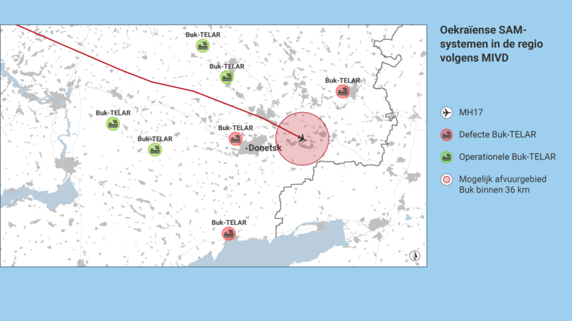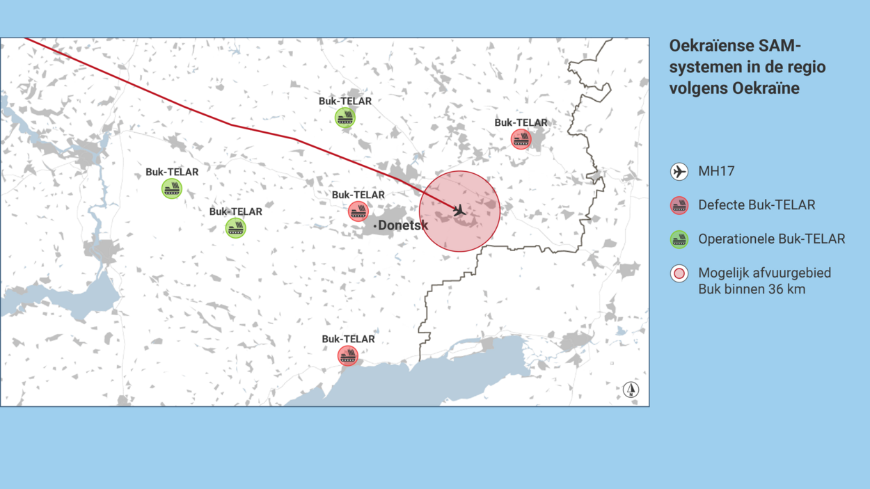 Daarnaast is onderzoek gedaan naar de locaties en activiteiten van Oekraïense Buk-systemen op basis van informatie van de Militaire Inlichtingen- en Veiligheidsdienst, Oekraïense autoriteiten en open bronnen. Dit heeft geen enkele aanwijzing opgeleverd dat MH17 zich binnen het bereik van de Oekraïense krijgsmacht bevond.