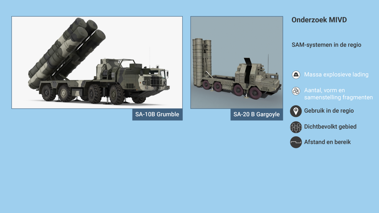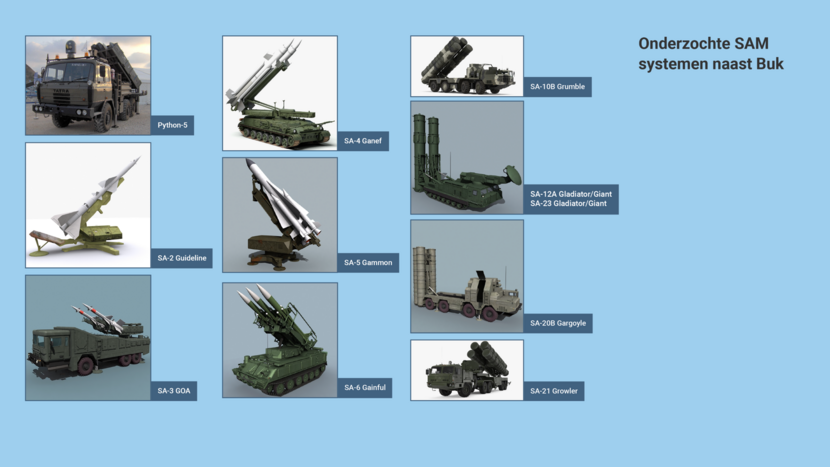 Daarvoor is onderzocht welke typen grond-lucht raketsystemen in juli 2014 in gebruik waren bij de Russische en Oekraïense strijdkrachten. Daarbij is gezocht naar wapensystemen met een hoogtebereik van 10 kilometer. Uit de gegevens van de flight data recorder blijkt immers dat MH17 op die hoogte is neergeschoten. Hieruit is gebleken dat er bij de Russische en Oekraïense strijdkrachten tien verschillende typen surface to air (of SAM)-wapensystemen bestonden met voldoende hoogtebereik.