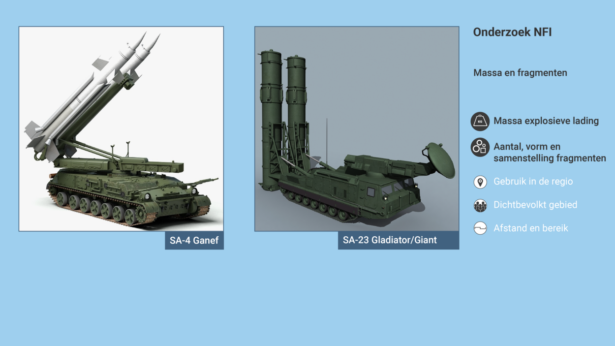 Vervolgens zijn deze tien wapensystemen voorgelegd aan een explosievendeskundige van het Nederlands Forensisch Instituut met de vraag of op basis van de (soms beperkte aanwezige) informatie over de explosieve lading van deze systemen kon worden vastgesteld welke van deze SAM-systemen mogelijk verantwoordelijk zouden kunnen zijn voor het neerhalen van MH17. Hierbij is gekeken naar de massa van de explosieve lading, het aantal, de vorm en de samenstelling van de fragmentatiedelen van de warheads van die SAM-systemen. Vervolgens heeft de deskundige van het Nederlands Forensisch Instituut dit vergeleken met het werkelijke schade- en sporenbeeld op basis van de wrakstukken van MH17. Omdat dit een onderzoek was naar andere systemen dan de Buk, heeft het Nederlands Forensisch Instituut de vastgestelde overeenkomsten van verschillende in het forensisch onderzoek aangetroffen materialen met onderdelen van een Buk-raket buiten beschouwing gelaten. Op die manier konden de resultaten van verschillende onderzoeken naast elkaar gewogen worden. Op basis van de schade aan de wrakdelen concludeert het Nederlands Forensisch Instituut dat die schade - naast de Buk-raket - alleen veroorzaakt zou kunnen zijn door twee van die andere tien SAM-systemen: de 2K11 Krug (SA-4 Ganef) en de S-300V (SA-23 Gladiator). Vervolgens is nader onderzoek gedaan naar deze twee overgebleven systemen.