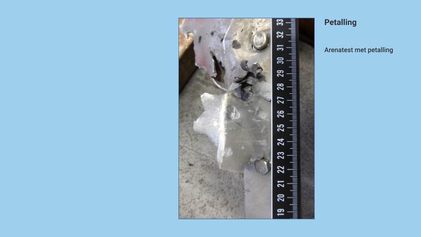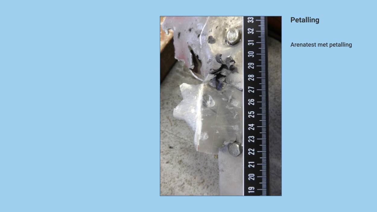- Daarnaast werden op verschillende vliegtuigonderdelen aan de buitenzijde perforaties waargenomen. De naar binnen gerichte perforaties zijn alleen te verklaren door de inslagschade van materiaal dat van buiten het vliegtuig is binnengedrongen. Ook is aan de buitenzijde schade zonder doorslag naar binnen aangetroffen, zoals schampschade. Deze vorm van schade is alleen te verklaren door een bron buiten het vliegtuig. Op plekken waar meerdere lagen plaatmateriaal waren samengeklonken, werden uitstulpingen naar buiten aangetroffen.Het ontstaan van dergelijke uitstulpingen als gevolg van een explosie wordt ook wel petalling genoemd. Bij de arenatest in Oekraïne, waar vergelijkbaar plaatmateriaal bij een exploderende Buk-raket werd geplaatst, werden vergelijkbare uitstulpingen waargenomen. Daarmee kon worden vastgesteld dat de naar buiten gerichte uitstulpingen in de wrakstukken van MH17 kunnen passen bij een externe explosie en niet veroorzaakt hoeven te zijn door een explosie aan boord.