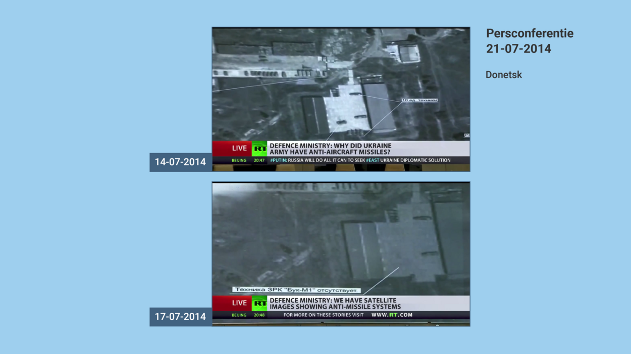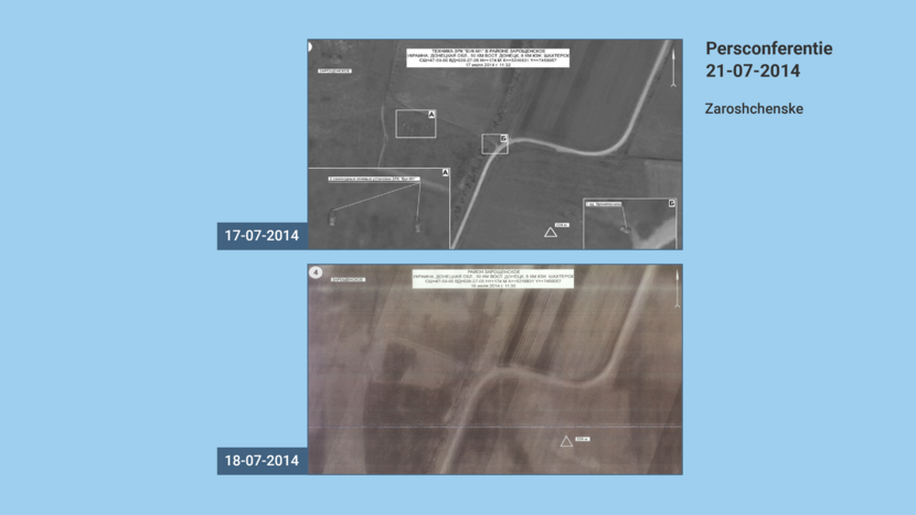 Vervolgens werd een satellietfoto getoond waarop twee Oekraïense Buk-systemen te zien zouden zijn in een veld ten zuiden van Zaroshchenske.Deze foto zou zijn gemaakt op 17 juli 2014. Op een foto van dezelfde plaats een dag later, op 18 juli 2014, waren deze systemen niet meer te zien. Daarmee werd de suggestie gewekt dat MH17 met één van deze Buk-systemen zou zijn neergeschoten.
