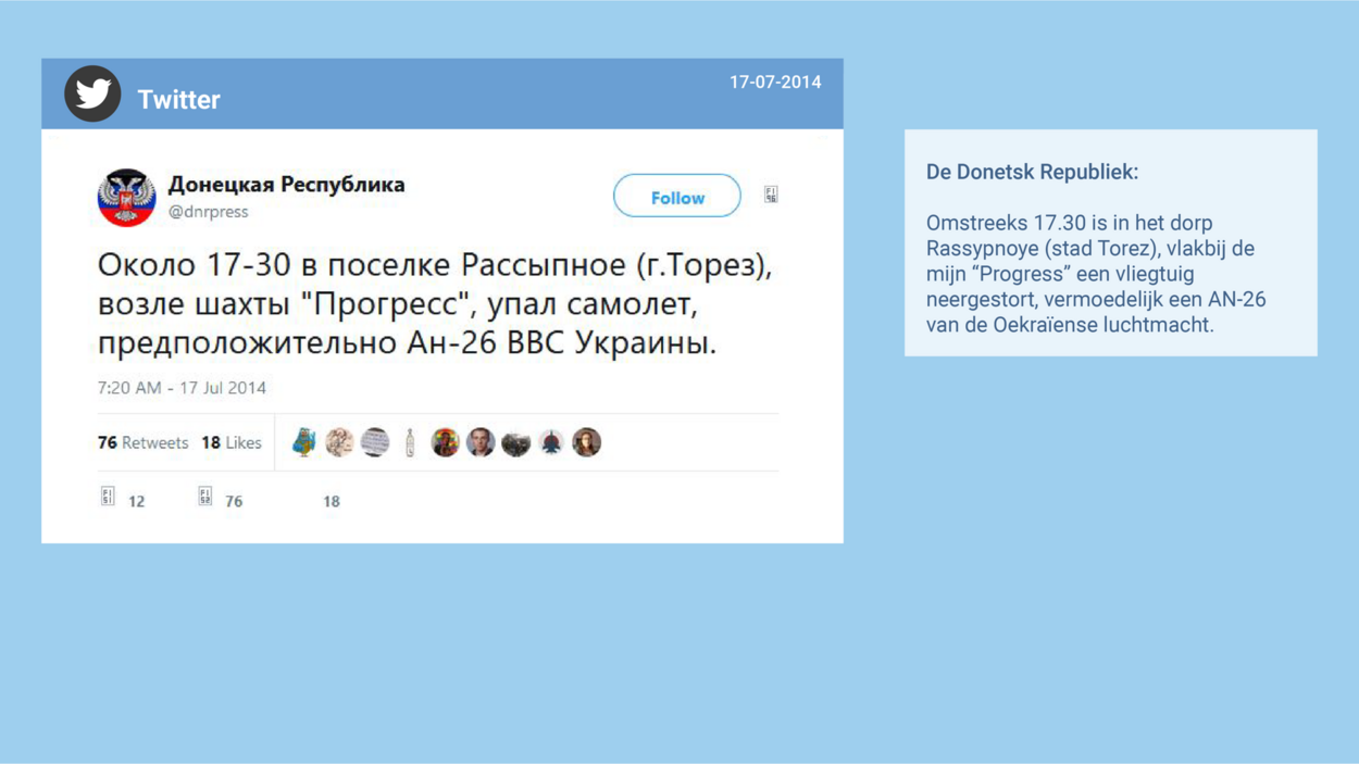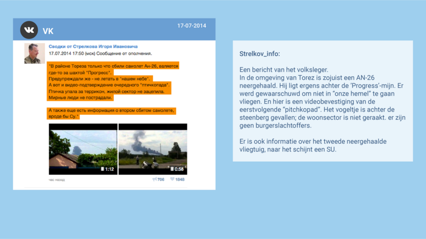 We beginnen met een schets van de reacties in de media en op sociale media. MH17 werd neergeschoten om 16:20 uur plaatselijke tijd. Direct in het eerste uur na het neerstorten van het toestel zien we dat van verschillende kanten wordt bericht over het neerschieten van een Oekraïens vliegtuig door de DPR. Om 16:41 uur wordt op het twitter account @Strelkov_info een bericht gedeeld dat vier minuten eerder werd geplaatst op de website VK.com/strelkov_info. VK is een Russisch social media platform, vergelijkbaar met Facebook. Het gearceerde deel van het VK bericht luidt: