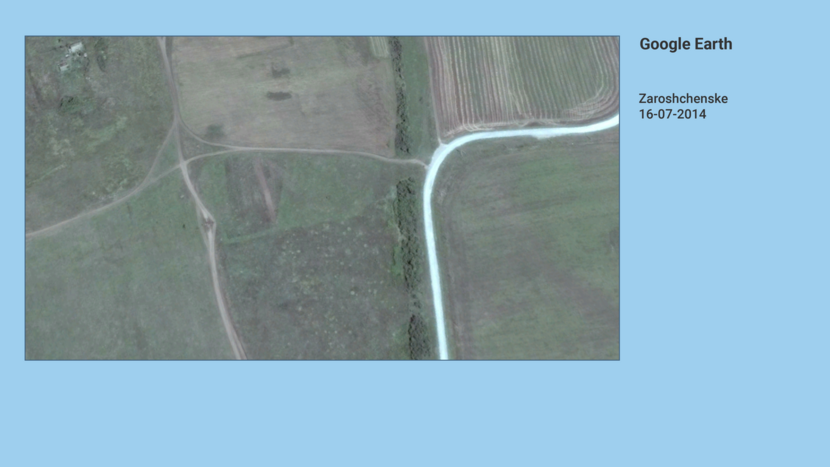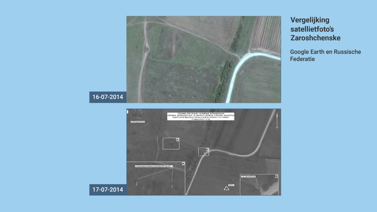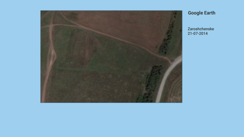 Soortgelijk onderzoek is gedaan naar de Russische satellietfoto’s van 17 en 18 juli 2014 van de locatie bij Zaroshchenske. Vergelijking van de foto van 17 juli 2014 met andere satellietfoto’s uit neutrale bronnen van hetzelfde gebied levert onverklaarbare verschillen op. Zo is op een satellietfoto van Google Earth van het gebied van 16 juli 2014 te zien dat er een veld is omgeploegd of bewerkt. Op de Russische foto ligt hetzelfde veld er ongerept bij. Deze foto kan dus niet, zoals wordt beweerd, op 17 juli 2014 zijn genomen. Verder zijn er op een Google Earth satellietfoto van ditzelfde gebied, van 21 juli 2014, dus een paar dagen na de veronderstelde lancering en afvoer van het lanceersysteem, geen sporen te zien van een lancering of lanceervoertuig. Terwijl uit onderzoek naar het Buk-systeem blijkt dat bij een lancering in droog veld brand kan ontstaan en de rupsbanden van de zware lanceervoertuigen sporen zullen achterlaten op onverhard terrein.