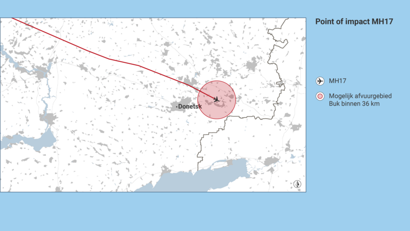 Op die locatie heeft de raket MH17 getroffen. In het dossier wordt dat ook wel de ‘point of impact’ genoemd. Als tussenconclusie is dus aangenomen dat de afvuurlocatie binnen een straal van 36 kilometer rondom dat punt moest liggen. Onderzoek naar het verloop van het conflict wijst uit dat dit grondgebied op 17 juli 2014 vrijwel geheel onder controle stond van DPR-strijders.