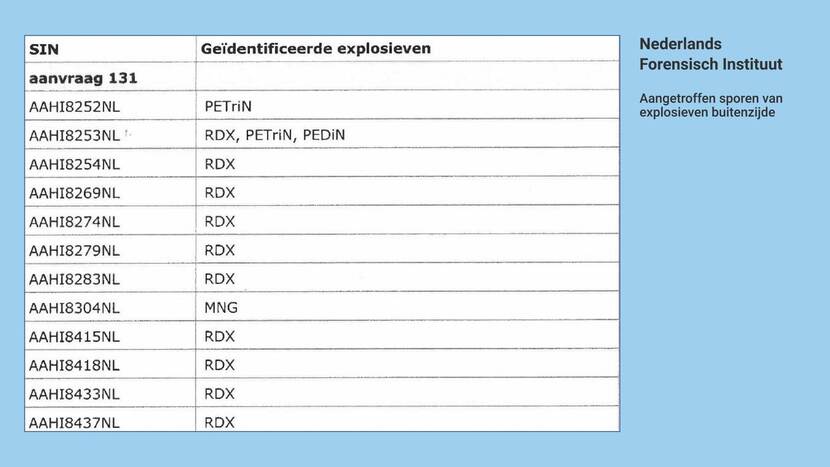 - Het Nederlands Forensisch Instituut (NFI) concludeerde na onderzoek aan wrakstukken dat de resultaten wezen op een explosie aan de buitenzijde van het vliegtuig. U ziet hier een deel uit een rapport van het Nederlands Forensisch Instituut (NFI) met de resultaten van het onderzoek naar sporen van explosieven.
