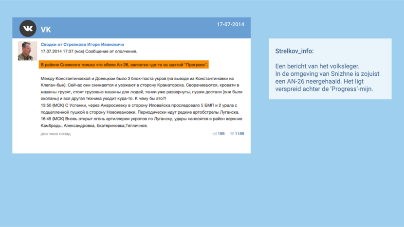 Hierbij zij opgemerkt dat Igor Girkin, die de bijnaam Strelkov heeft, in een getuigenverhoor afgenomen door de Russische Federatie heeft verklaard dat de berichten op VK namens Strelkov (over het neerhalen van een AN-26 en andere vliegtuigen) niet door hem zijn gepubliceerd. Dat Girkin niet zelf de berichten heeft geplaatst wordt ook medegedeeld op het betreffende VK-account. Daarbij wordt gesteld dat de “informatie over het neerschieten van het vliegtuig afkomstig is van een forum waar de lokale bevolking converseert met de opstandelingen”.[6] Dergelijke berichten zouden zijn verzameld uit “openbare bronnen” en “dagboeken van de opstandelingen en van ooggetuigen”.[7] Dit maakt deze berichten niet minder belangrijk. Hierin is namelijk te zien dat direct na het neerschieten geclaimd wordt dat er een vliegtuig is neergeschoten vanuit de omgeving van Snizhne door het ‘volksleger’, zoals de DPR zichzelf wel noemde.