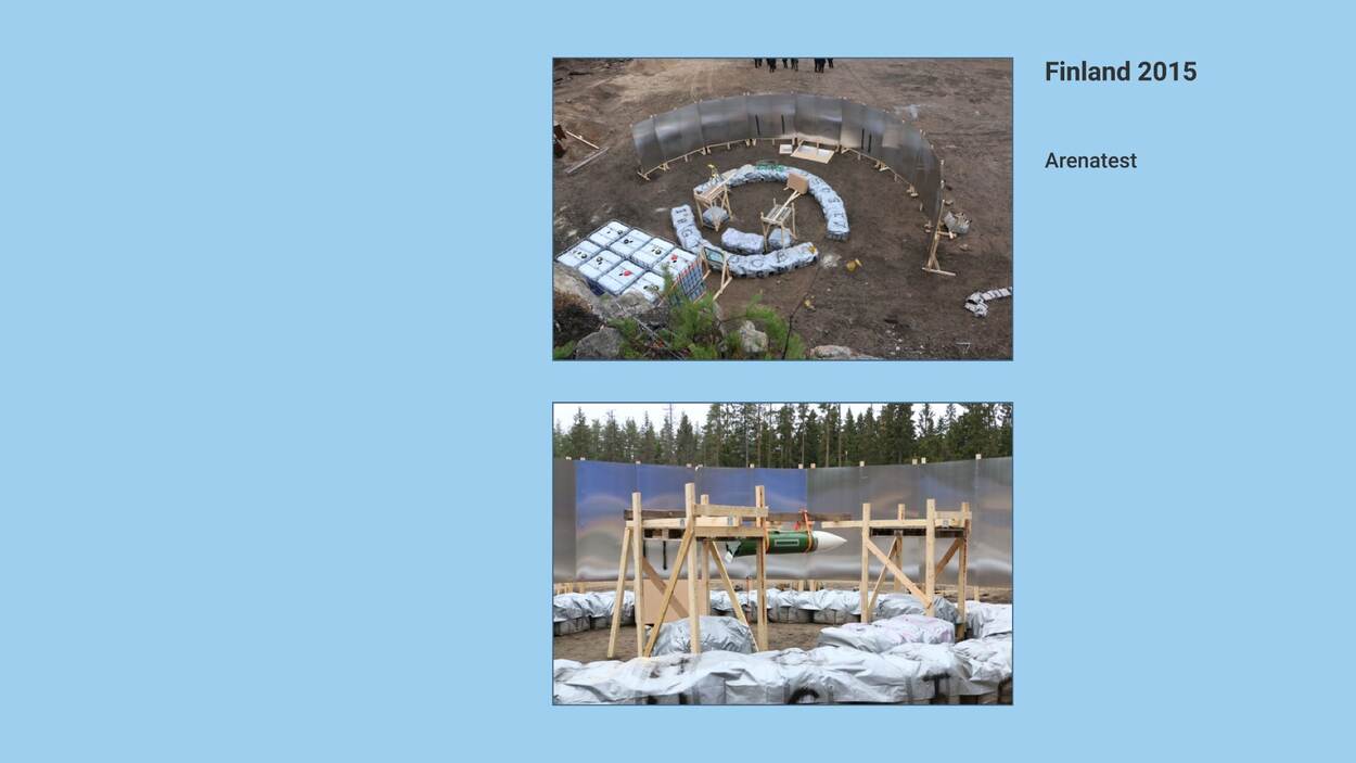 Hier zien we de arenaopstelling van boven. We laten zo de beelden zien van de arenatest met de warhead. Het gaat twee keer om dezelfde test. Eerst in werkelijke snelheid. Daarna vertraagd. Het beeld is opgenomen vanaf de buitenkant van de arenaopstelling. De achterkant van de getuigenplaten is zichtbaar. Bij de detonatie is in eerste instantie een vuurbal te zien. Na detonatie worden de fragmentatiedeeltjes met hoge snelheid vanaf het detonatiepunt afgevuurd. Dat is te zien aan de oplichtende puntjes in de getuigenplaten en het opspringende stof. Door de drukgolf worden de getuigenplaten weggeblazen en wordt de arenaopstelling vernietigd. Duidelijk zichtbaar is dat de fragmentatie al voor de drukgolf het doel (in dit geval: de getuigenplaten) raakt.
