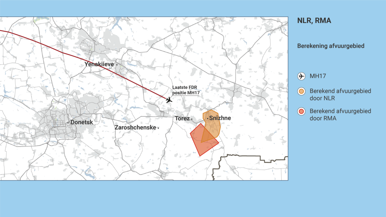 Het Nederlands Lucht- en Ruimtevaartcentrum is uitgekomen op een gebied van 75 vierkante kilometer ten zuidoosten van de positie waarop MH17 het laatste signaal heeft afgegeven. Alleen Buk-raketten die vanuit dit gebied zijn afgeschoten, kunnen volgens het NLR de schade aan MH17 hebben veroorzaakt. De uitkomst van de berekening van de Belgische Koninklijke Militaire School overlapt gedeeltelijk met dit gebied.