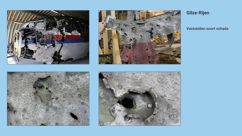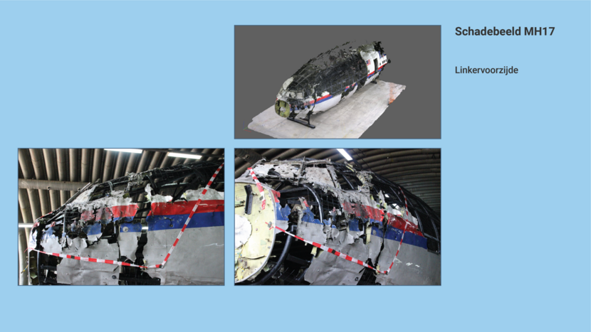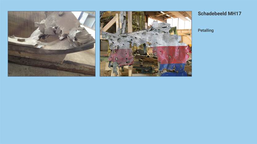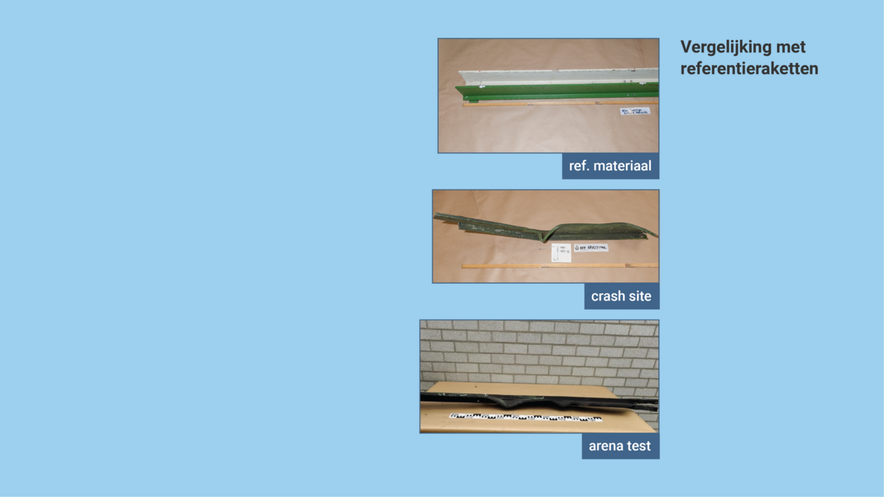 - vergelijking van het op de wrakdelen waargenomen petalling-effect met de schade na de arenatesten met een Buk-raket en warhead.