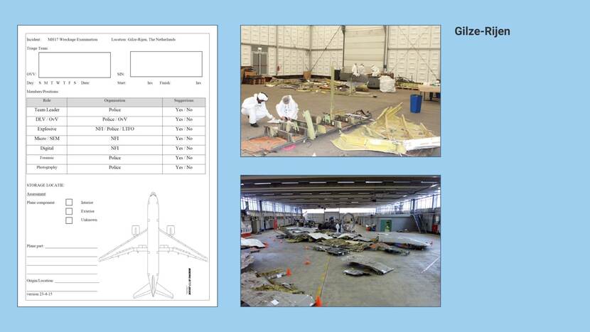 De wrakdelen zijn in drie konvooien naar Nederland gebracht. Een eerste konvooi van zestien vrachtwagens met opleggers, een tweede met acht containers en een derde met twee kleinere containers. Elk wrakdeel is in Gilze-Rijen gefotografeerd en genummerd en daarna visueel geïnspecteerd aan de hand van een controlelijst. Tijdens deze inspectie werd beoordeeld of het wrakdeel afkomstig was van MH17 of niet en zo ja, om welk onderdeel van het toestel het ging. Bij deze beoordeling werd gebruik gemaakt van de expertise van de specialisten van de Dienst Luchtvaart van de Nationale Politie en informatie van vliegtuigfabrikant Boeing. Hier werkten de forensische experts en de luchtvaartrechercheurs naast de luchtvaartonderzoekers van de Onderzoeksraad voor Veiligheid. Elk vanuit hun eigen taak en verantwoordelijkheid. Verder werden er van de wrakdelen monsters - of ‘swabs’ - genomen voor explosievenonderzoek.