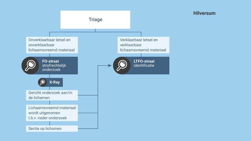 Werkstation 3: Hier vond de triage plaats door een forensisch specialist, een explosievendeskundige en een patholoog. Triage is een term die in forensisch onderzoek gebruikt wordt voor het sorterings- en selectieproces. Eerst werd de kist geopend en daarna werden de menselijke resten visueel onderzocht. Op basis van die visuele bevindingen en het scan-verslag van de radioloog werd besloten of er aanvullend diepgravend forensisch onderzoek moest plaatsvinden. De centrale vraag was steeds of er sprake was van onverklaarbaar letsel of onverklaarbaar lichaamsvreemd materiaal. In het eerste geval werd er nader forensisch onderzoek verricht. In het tweede geval werd het stoffelijk overschot overgedragen aan het Landelijk Team Forensische Opsporing (LTFO) voor onderzoek naar de identiteit van het betreffende slachtoffer.