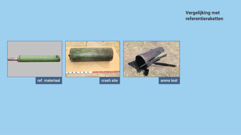 - vergelijking van de kenmerken (waaronder elementsamenstelling) van deze staalresten met die van fragmentatiedelen van een 9N314M warhead van een Buk-raket;