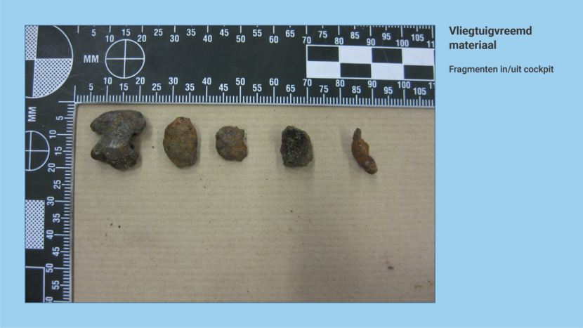 Naast dit onderdeel zijn er nog meer vliegtuigvreemde materialen aangetroffen in de wrakdelen. Deze bevonden zich in andere delen van de cockpit, in de linkervleugel en de in de binnenzijde van de rechtervrachtdeur. Ook hiervan is de elementsamenstelling vergeleken met die van verschillende onderdelen van de referentieraketten. Voor zover deze delen groot genoeg waren, zijn ook de visuele kenmerken ervan vergeleken met die van referentieraketten. Verder heeft het NFI de verf die op verschillende van deze vliegtuigvreemde materialen werd aangetroffen, vergeleken met verf afkomstig van de referentieraketten.