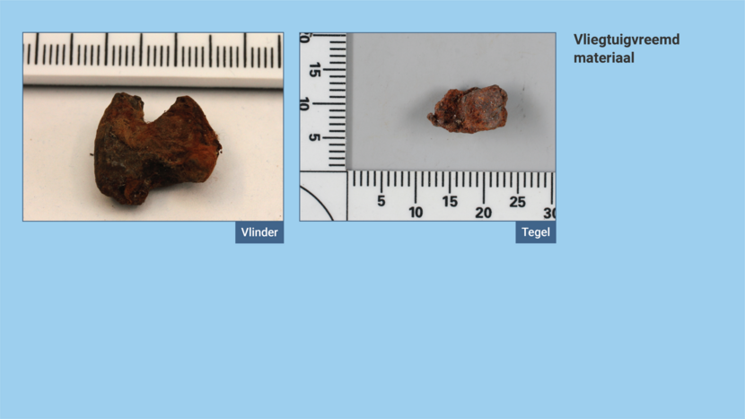 - Verschillende fragmenten, waaronder het vlindervormige fragment, dragen sporen van opgesmolten glas. De samenstelling van die sporen is vergeleken met cockpitglas van een Boeing.