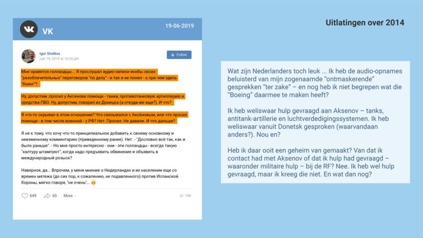 Informatie van de Russische overheid over de rollen van de verdachten hebben we ook opgenomen in het dossier. Dat geldt bijvoorbeeld voor de verklaring die verdachte Girkin aflegde als getuige in februari 2015 tegenover de autoriteiten van de Russische Federatie. In maart vertelden wij al op zitting dat Girkin in dat verhoor tegenover de Russische autoriteiten verklaart dat hij op 17 juli 2014 na het neerschieten van vlucht MH17 werd geïnformeerd dat zijn mannen een vliegtuig hadden neergeschoten. Onze uitnodiging aan verdachte Girkin om uitleg te geven welk vliegtuig hij daar bedoelt, geldt nog steeds.