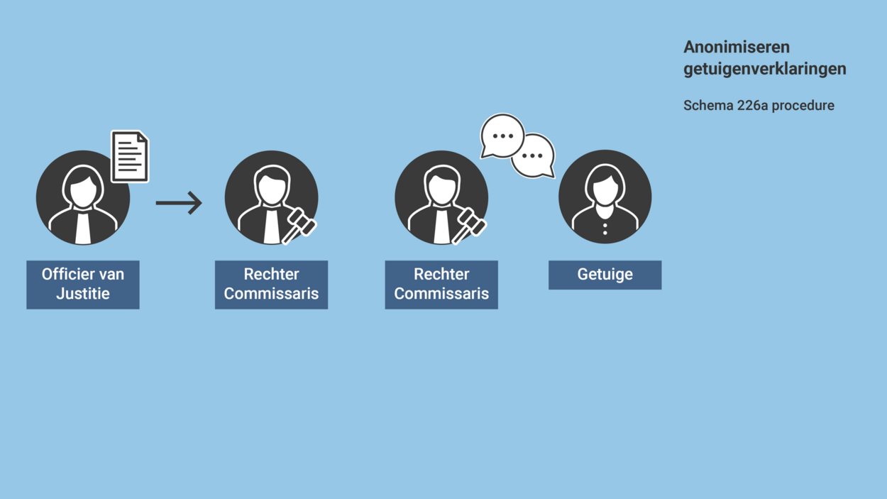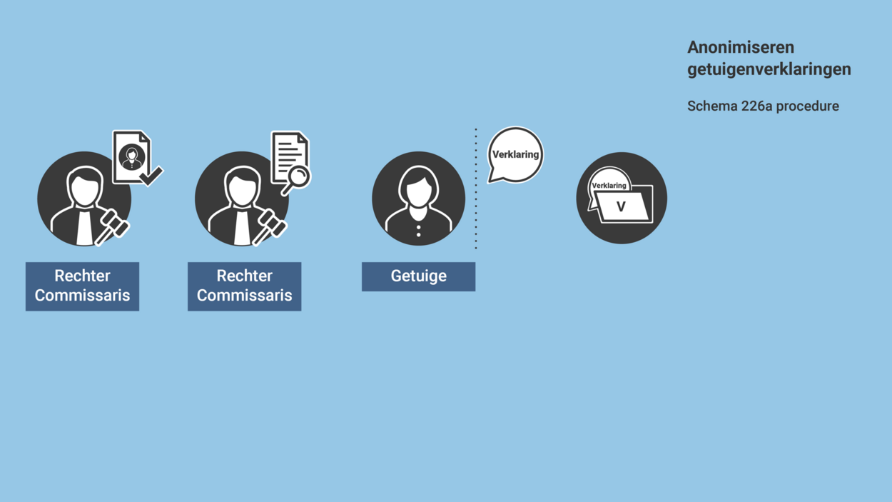 Van het vaak zeer uitgebreide verhoor van de getuige, maakt de rechter-commissaris voor het procesdossier een aparte, geanonimiseerde verklaring op. Die geanonimiseerde verklaring is samen met een verslag van het betrouwbaarheidsonderzoek door de rechter-commissaris inmiddels voor alle 226a-getuigen in het procesdossier gevoegd. Het Openbaar Ministerie en de verdediging zijn bij de verhoren door de rechter-commissaris niet aanwezig geweest maar kunnen ook aan deze getuigen nog wel aanvullende vragen laten stellen. Deze categorie van zogenaamde 226a-getuigen heeft steeds een getuigencode die begint met de letter V, met uitzondering van getuige X48.
